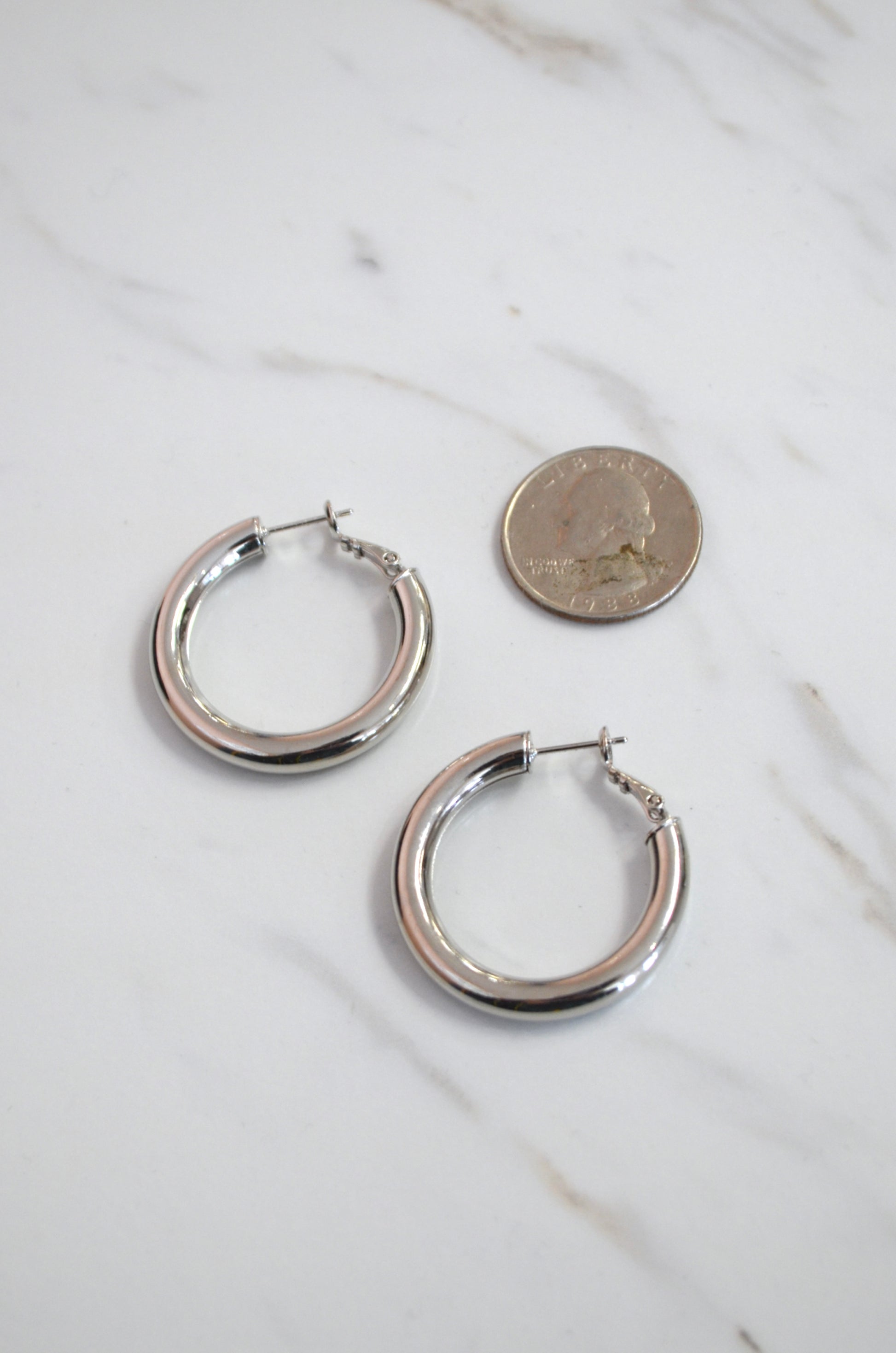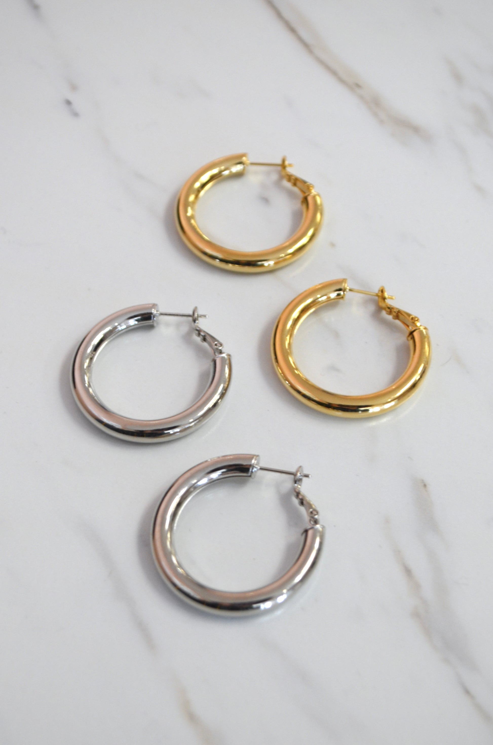 14k gold and silver dipped hoops. These latch closure hoops are easy to wear and style. Hollow metal design is lightweight and perfect for all-day wear. Smooth and shiny finish along the surface. Mid-sized and modern.