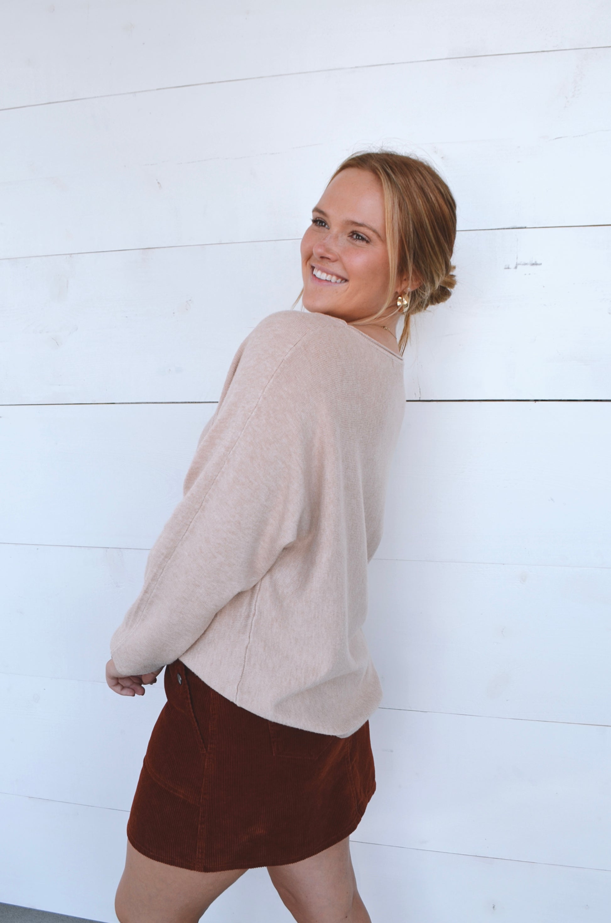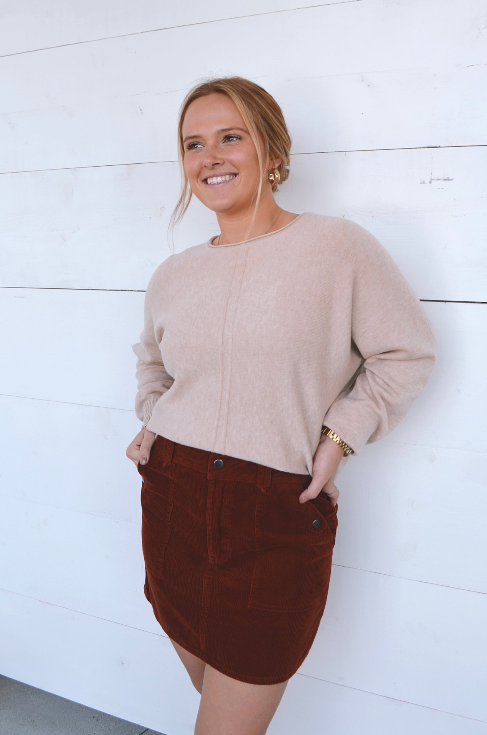 Ultra soft, sweater, top with a relaxed fit. Made from a stretchy and lightweight fabric. Timeless round neckline is easy to style! This top has long-sleeves with a ribbed cuff sleeve. Modern seamlines run down the front and create an elevated appearance. Semi-cropped design with a shorter hemline in front than in back. Great for tucking or wearing out.