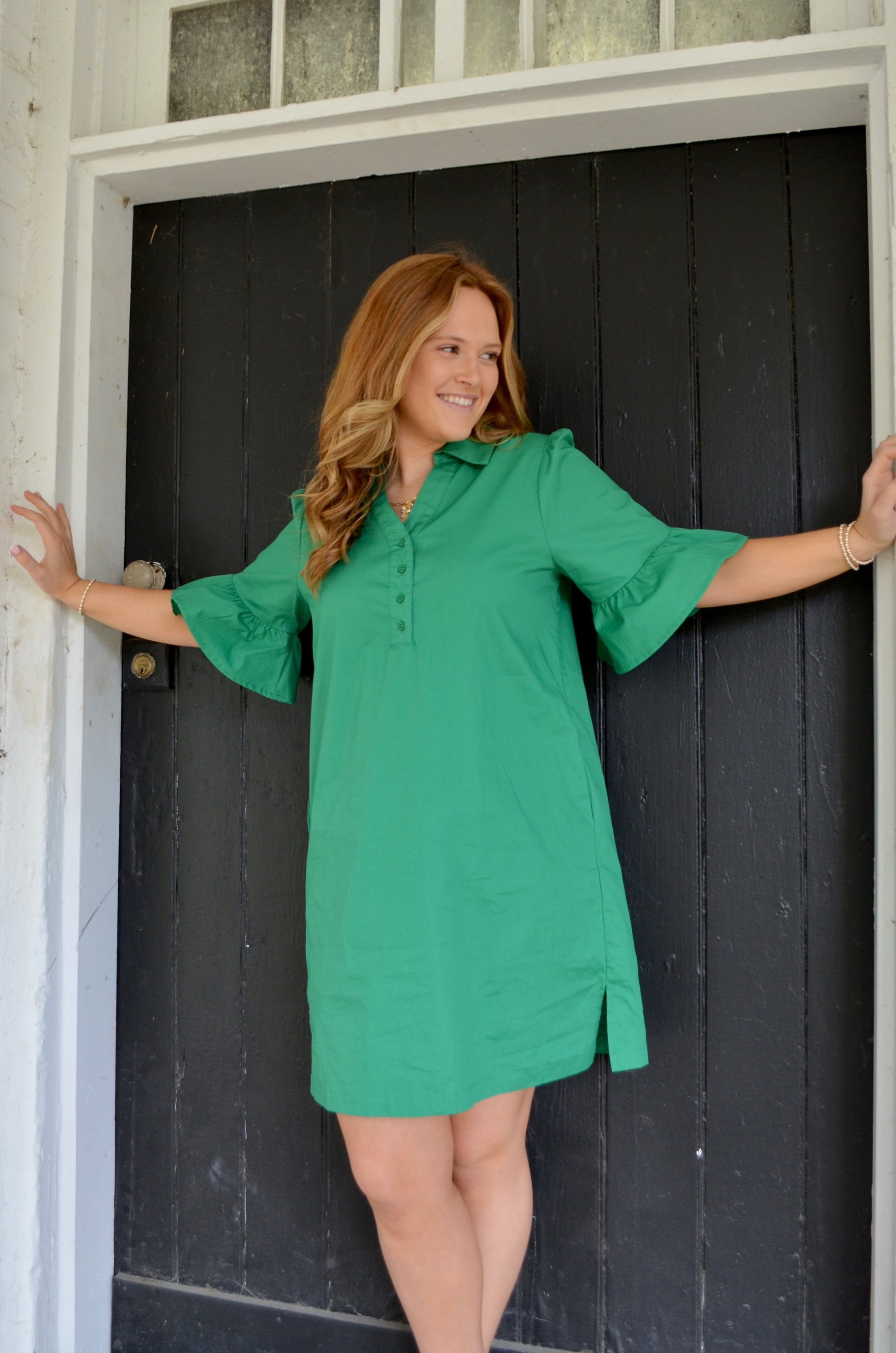 Southern chic, 100% cotton, shift dress. This straight fit mini has a boxy silhouette and a structured shoulder and sleeve. Made from a breathable fabric with little to no stretch. The collared neckline and half-button detail add an elevated touch to this simplistic dress. It features hidden side pockets stitched into the side seams and well as a built in liner for convenience and comfort. Side split hem adds ease and a feminine/modern touch.