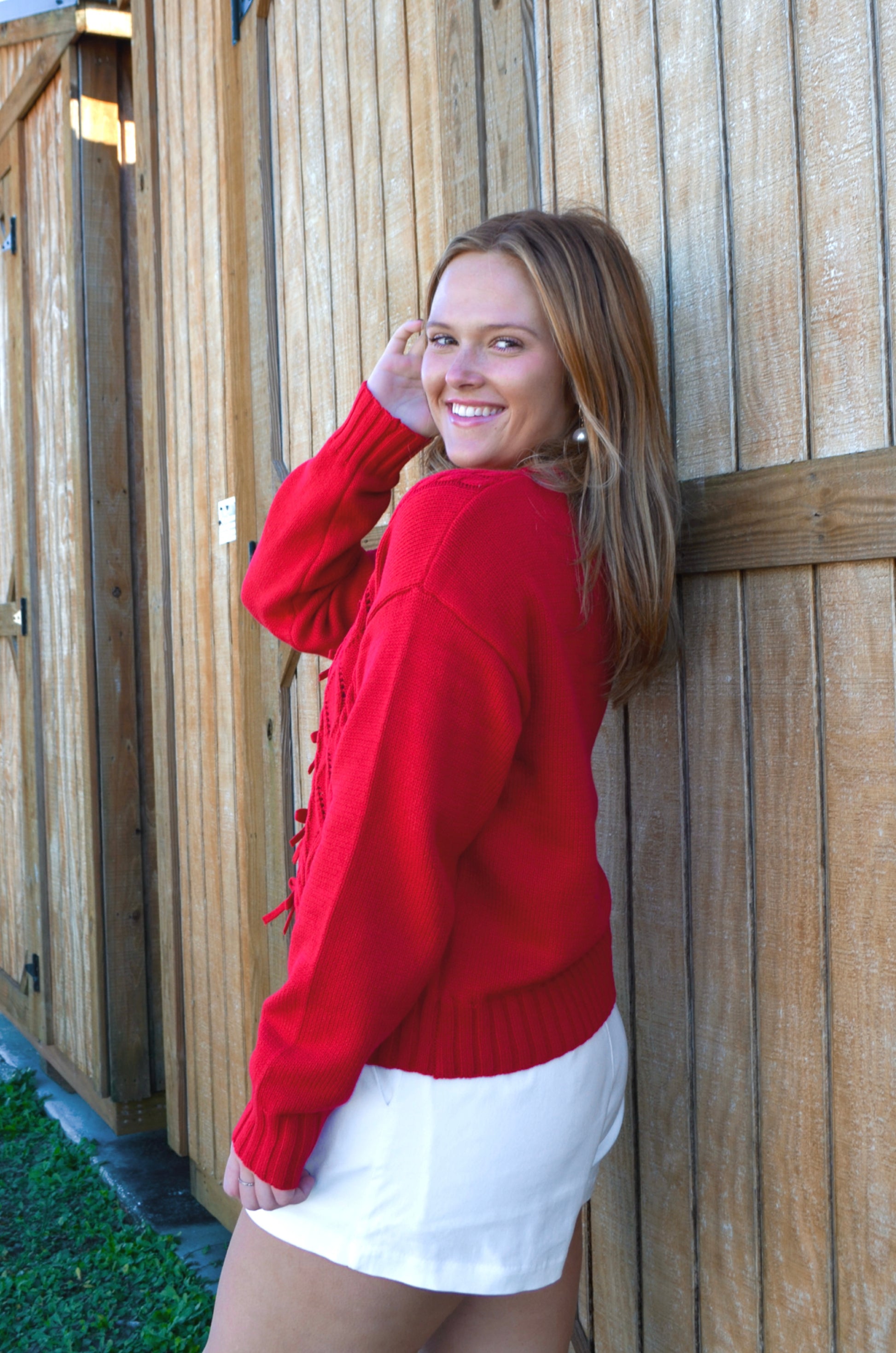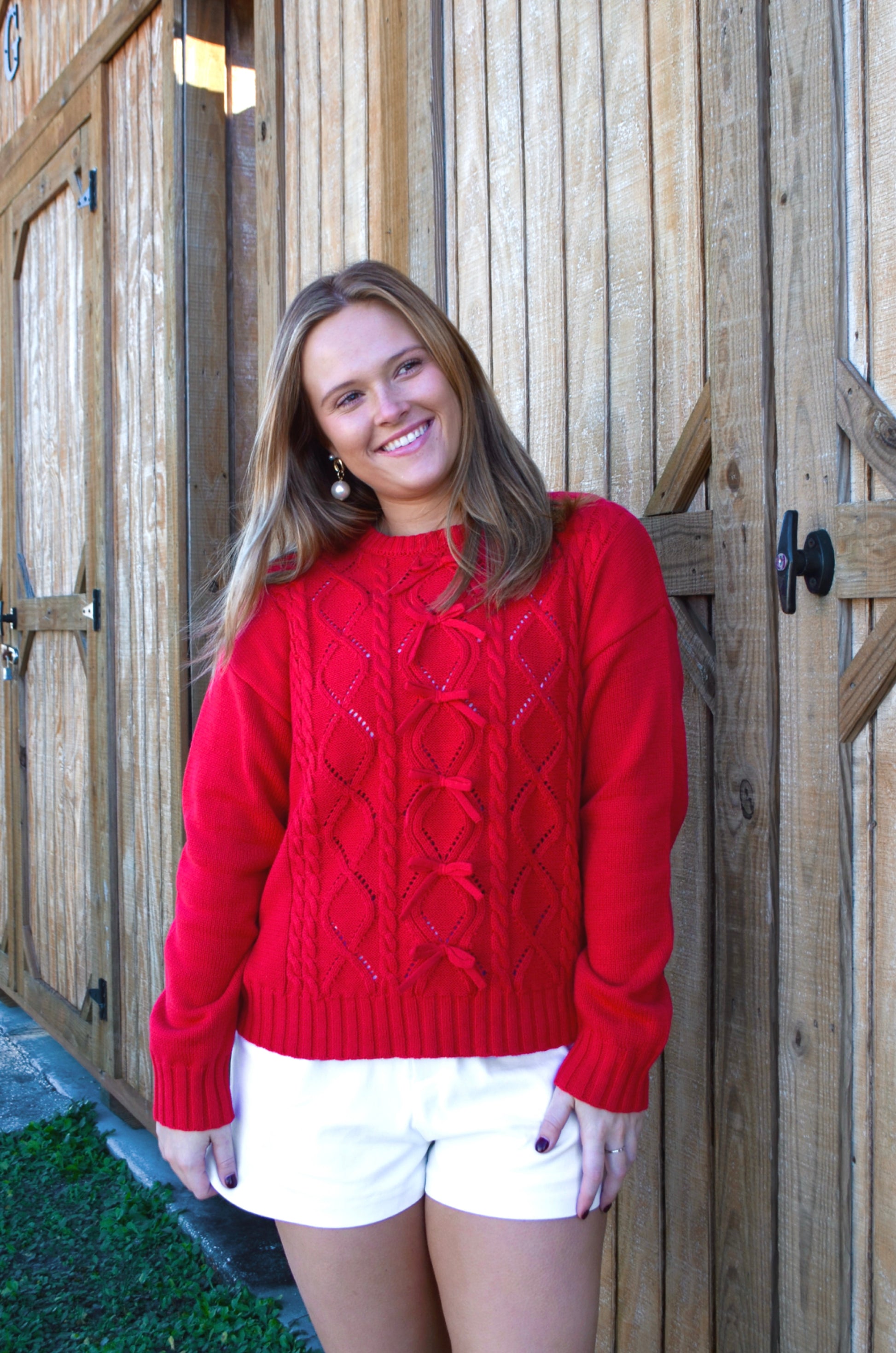 Feminine and chic, bow-front, sweater. This cable-knit top is warm but breathable. Unique bow detail down the front is perfect for holidays or everyday wear. Long-sleeved design with a full-length silhouette. Chunky ribbed design can be seen on the wrist and hem of this sweater. The front knit detail is see-through and requires a layer underneath. Luxurious knit material is smooth and stretchy.