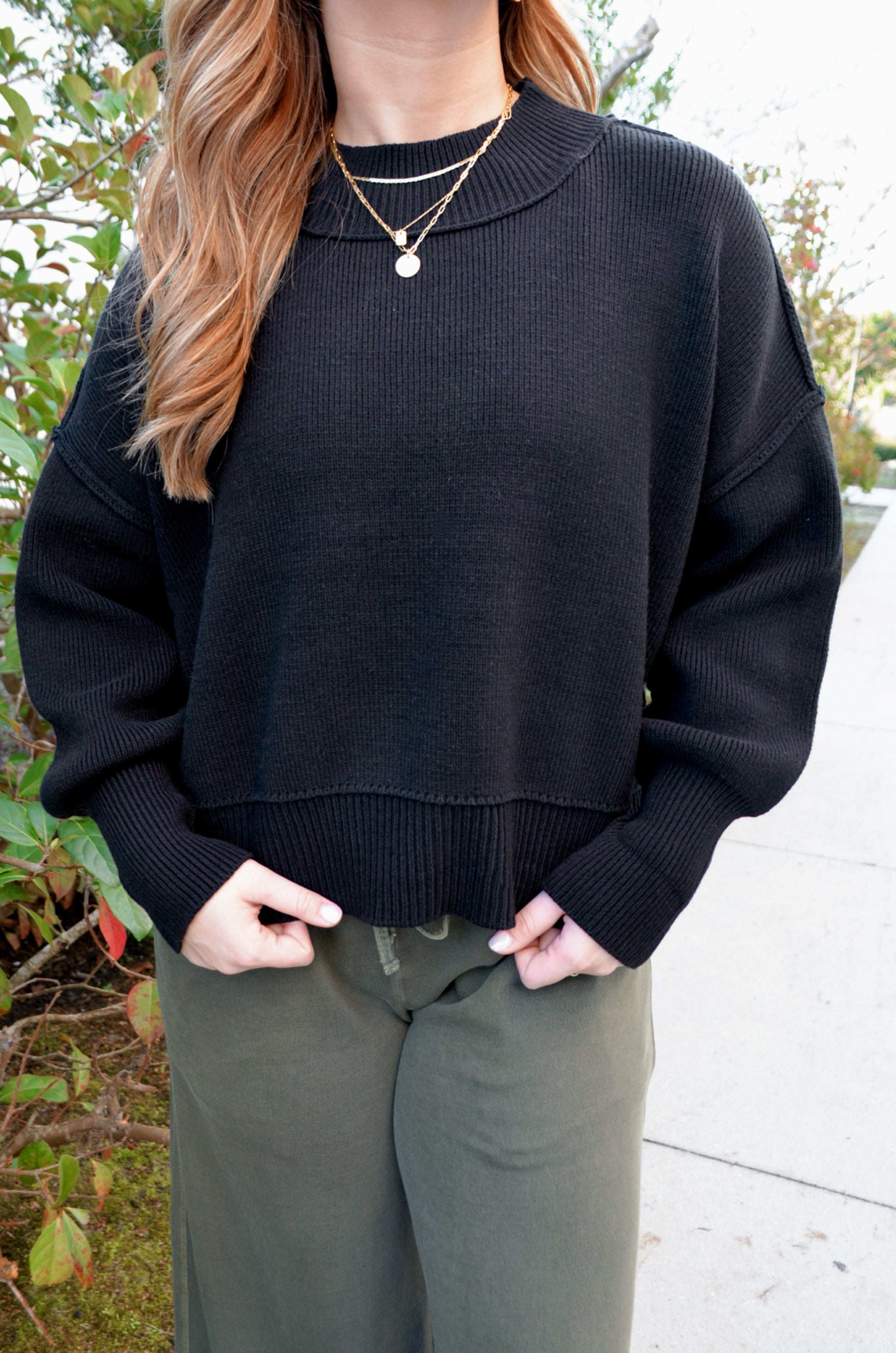 Modern, trendy, sweater with a semi-cropped hemline. This weighted knit is made from a durable, soft, and stretchy material. Exposed seamlines as well as a split hemline creates a 'vintage' appearance. This top features a drop-shoulder design and cuffed wrists. It can be dressed up or down but is perfect for everyday wear.