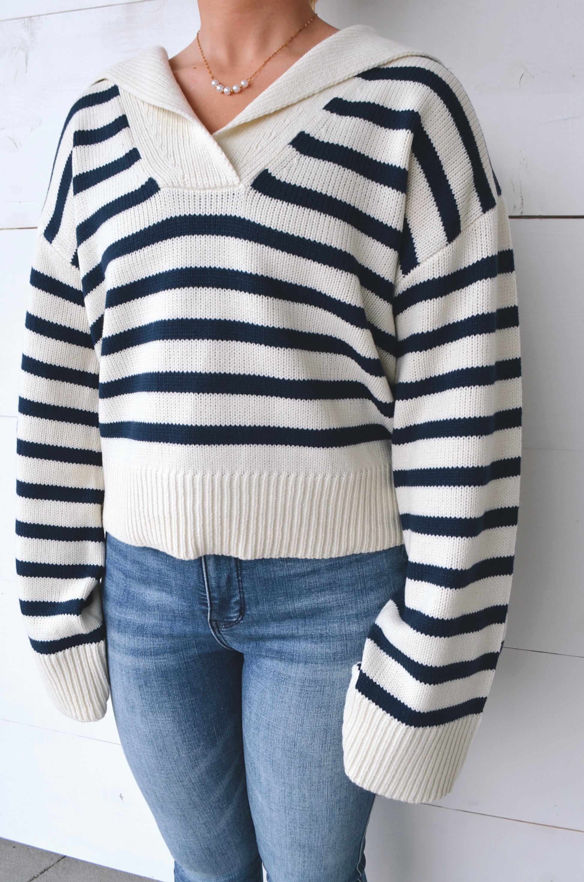 Stop people in their tracks with our nautical Brandy Sailor Sweater. Inspired by the coastal lifestyle with a unique collared neckline and thick striped pattern. Made from a mid-weight knit that is soft, smooth, and stretchy. This top is semi-cropped and has a boxy silhouette. The dramatic, oversized, sleeves can be rolled for a shorter, cuffed, appearance.