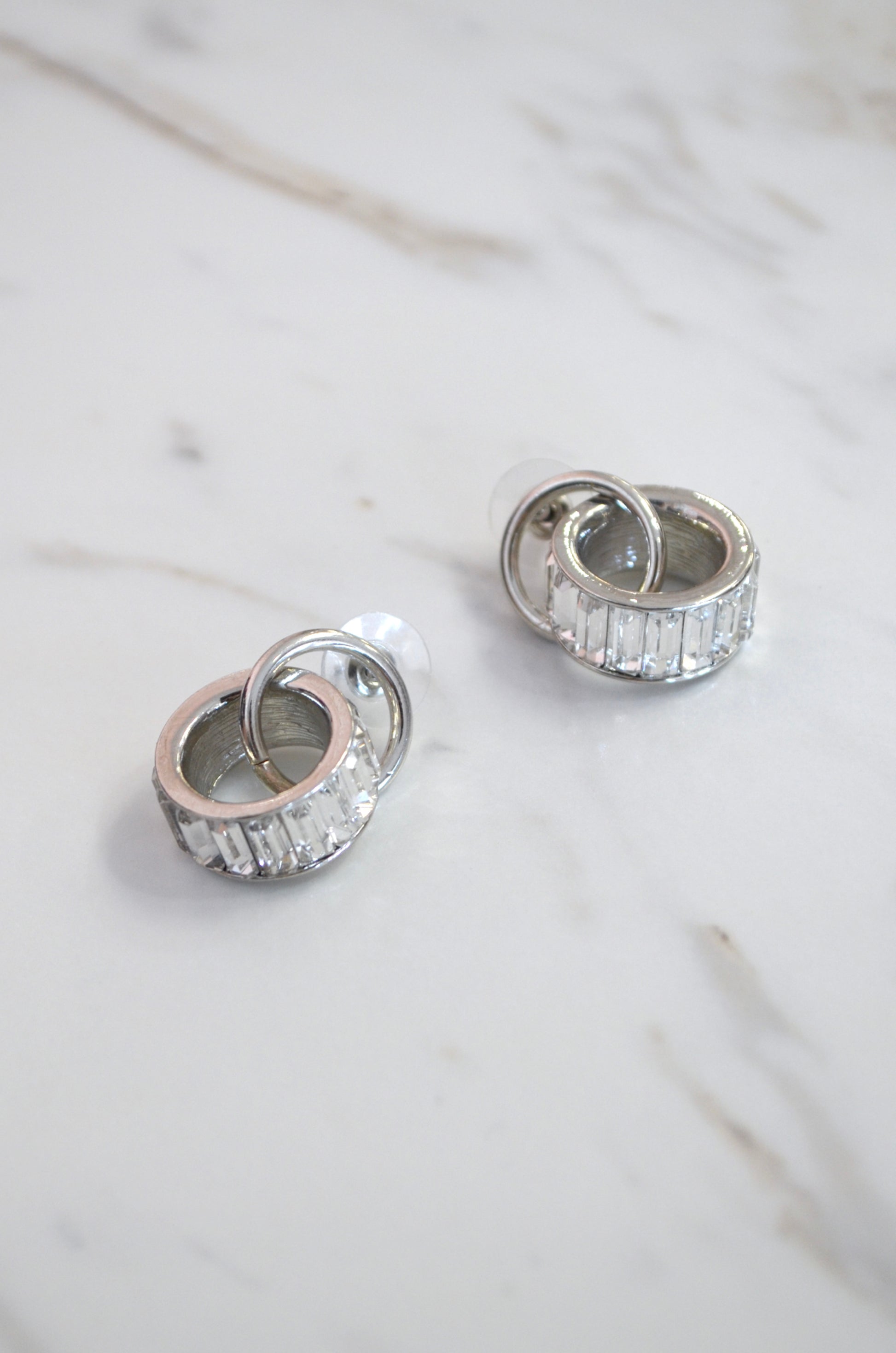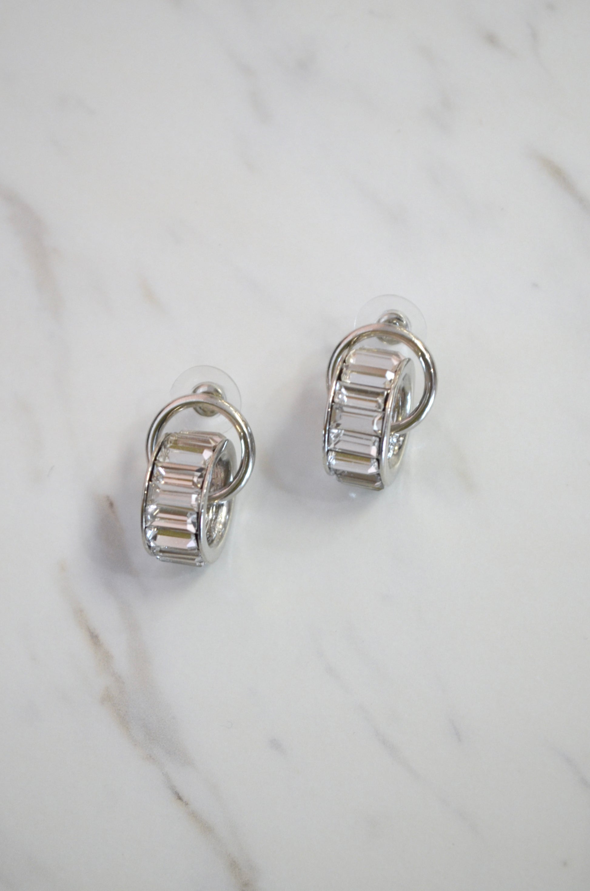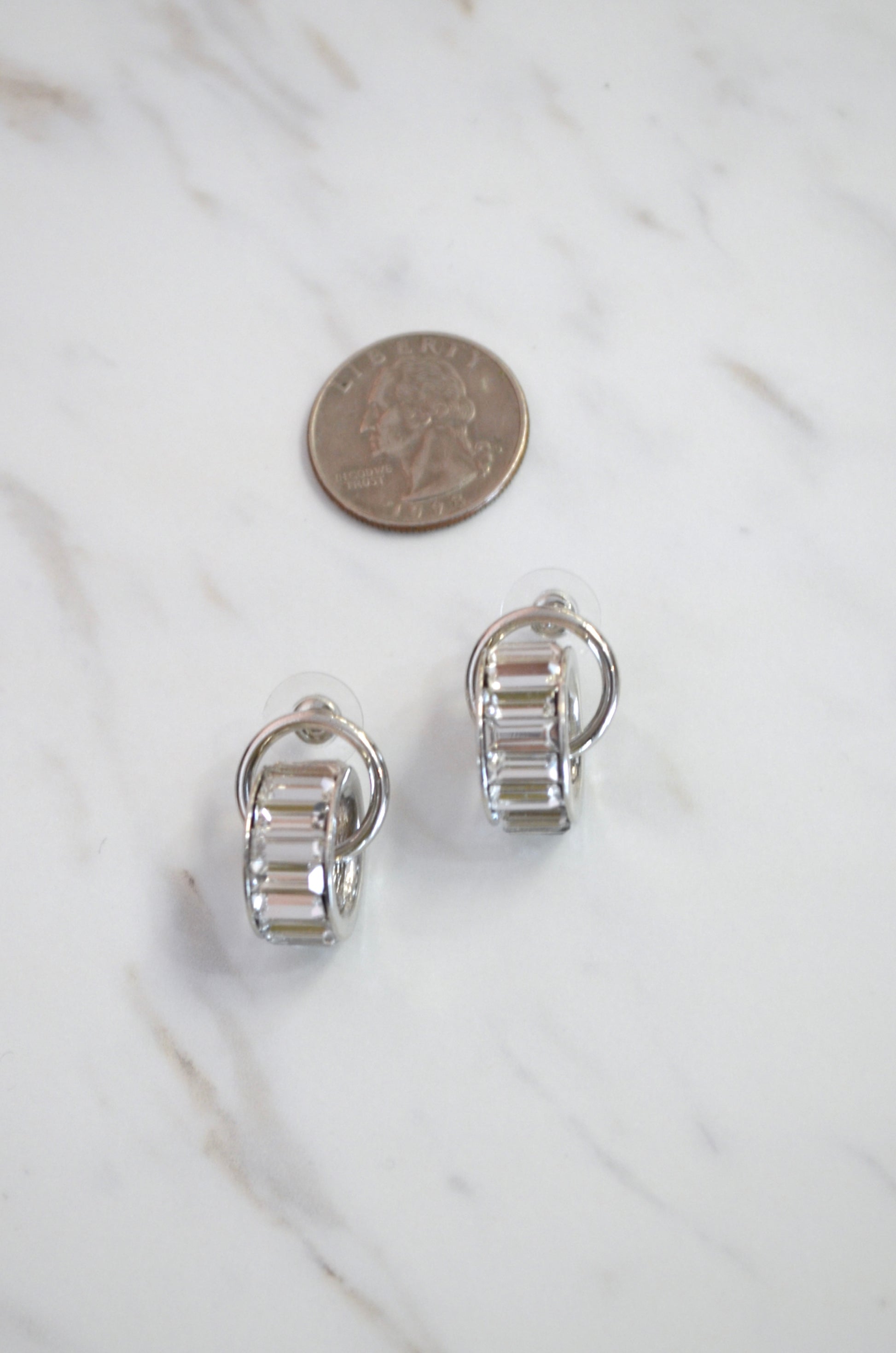 Chic and shiny, silver studs. These stud-back earrings are round in shape and have a baguette cut gemstone design that circles the accessory.