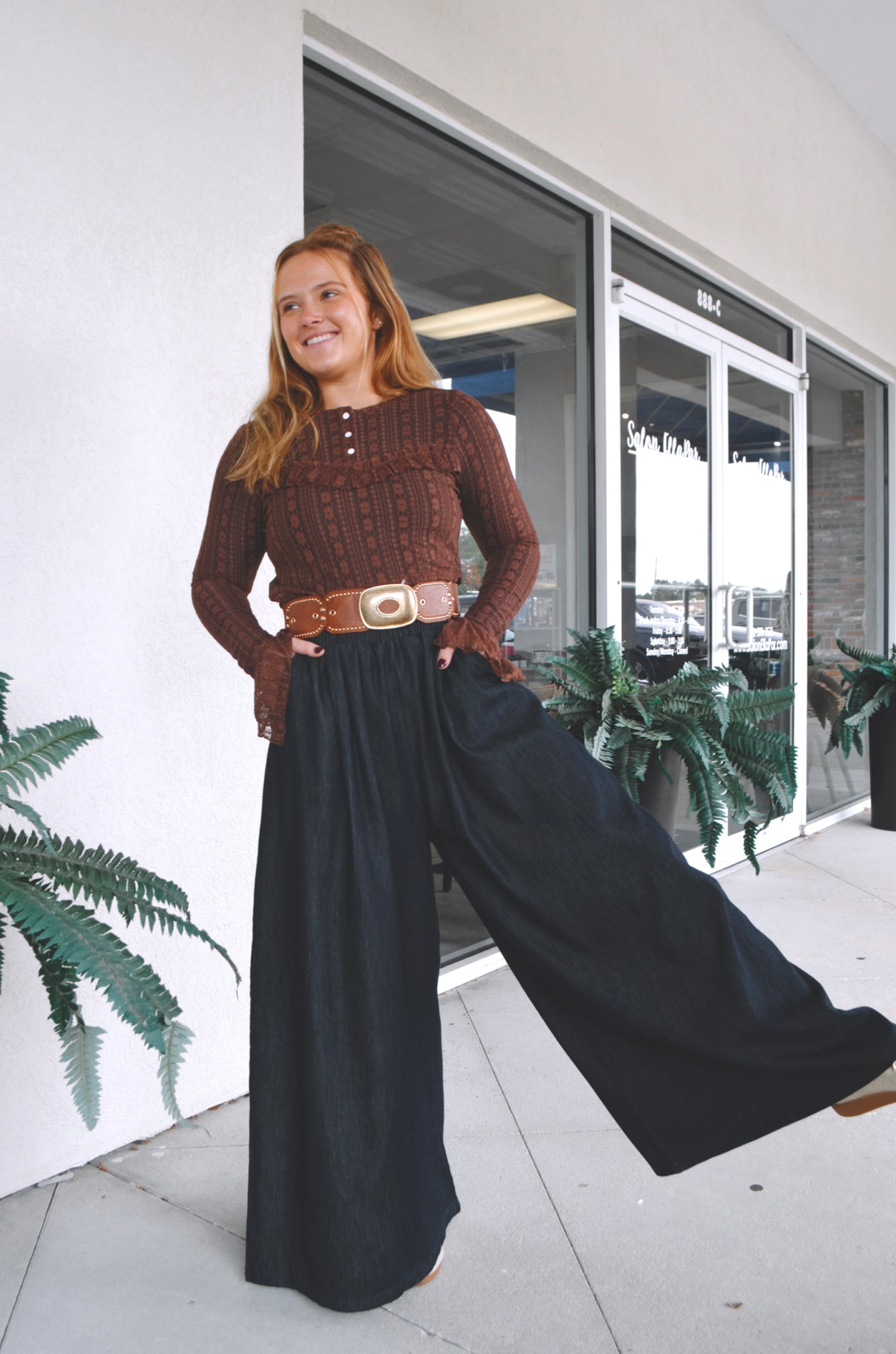 Dramatic, wide-leg, palazzo pants. These smooth bottoms have a palazzo/trouser fit and an elastic banded waistline. Feel comfy and casual while rocking the BEST bottoms in the room. These lightweight pants have side slat pockets and a dark denim appearance.