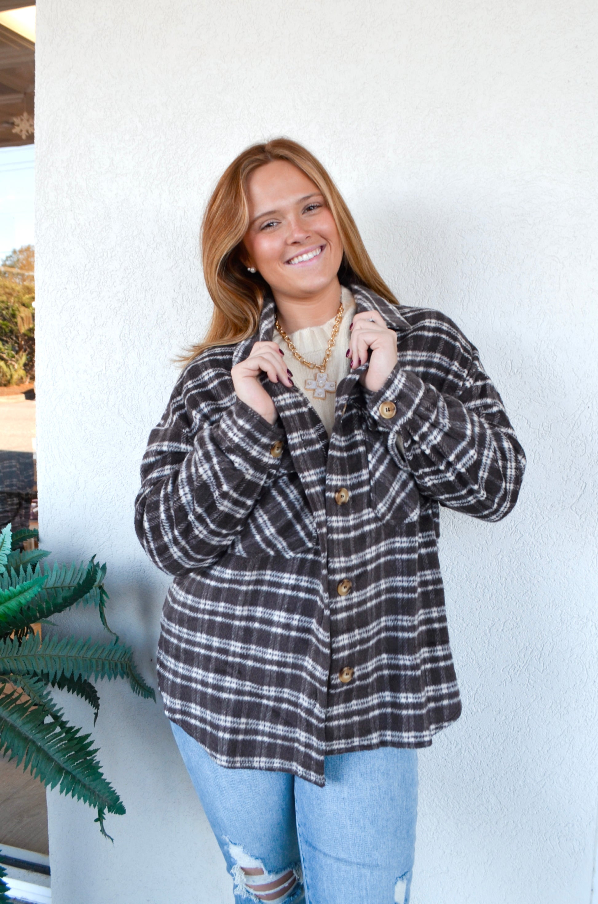 Mid-weight, plaid, shacket. This layering piece has a soft outside and smooth inner lining. The relaxed shape has a casual appearance but can be dressed up. Large tortoise shell buttons can be seen along the front of this jacket as well as on the cuff. It features a timeless, collared, neckline and functional pockets in the front.