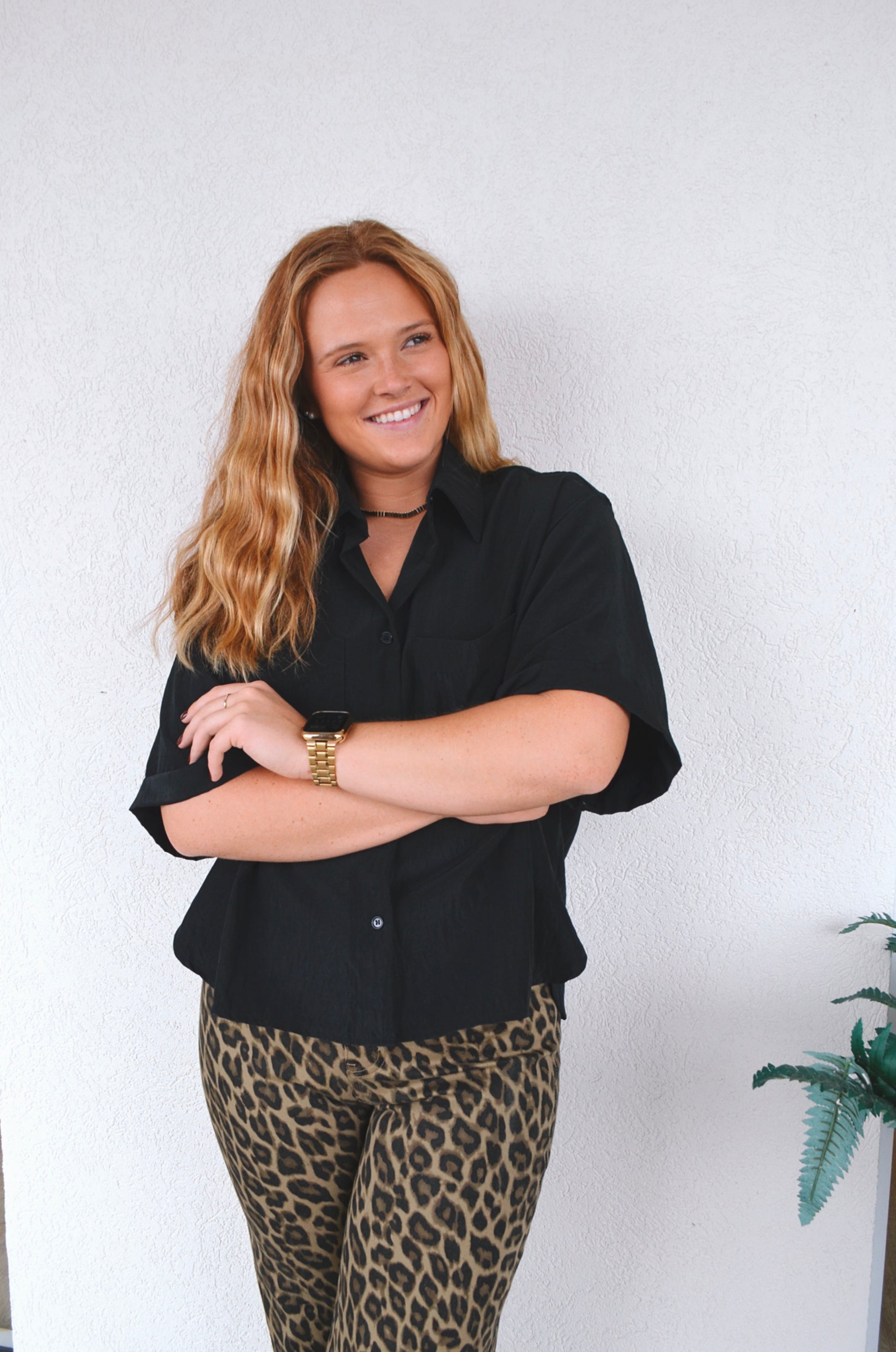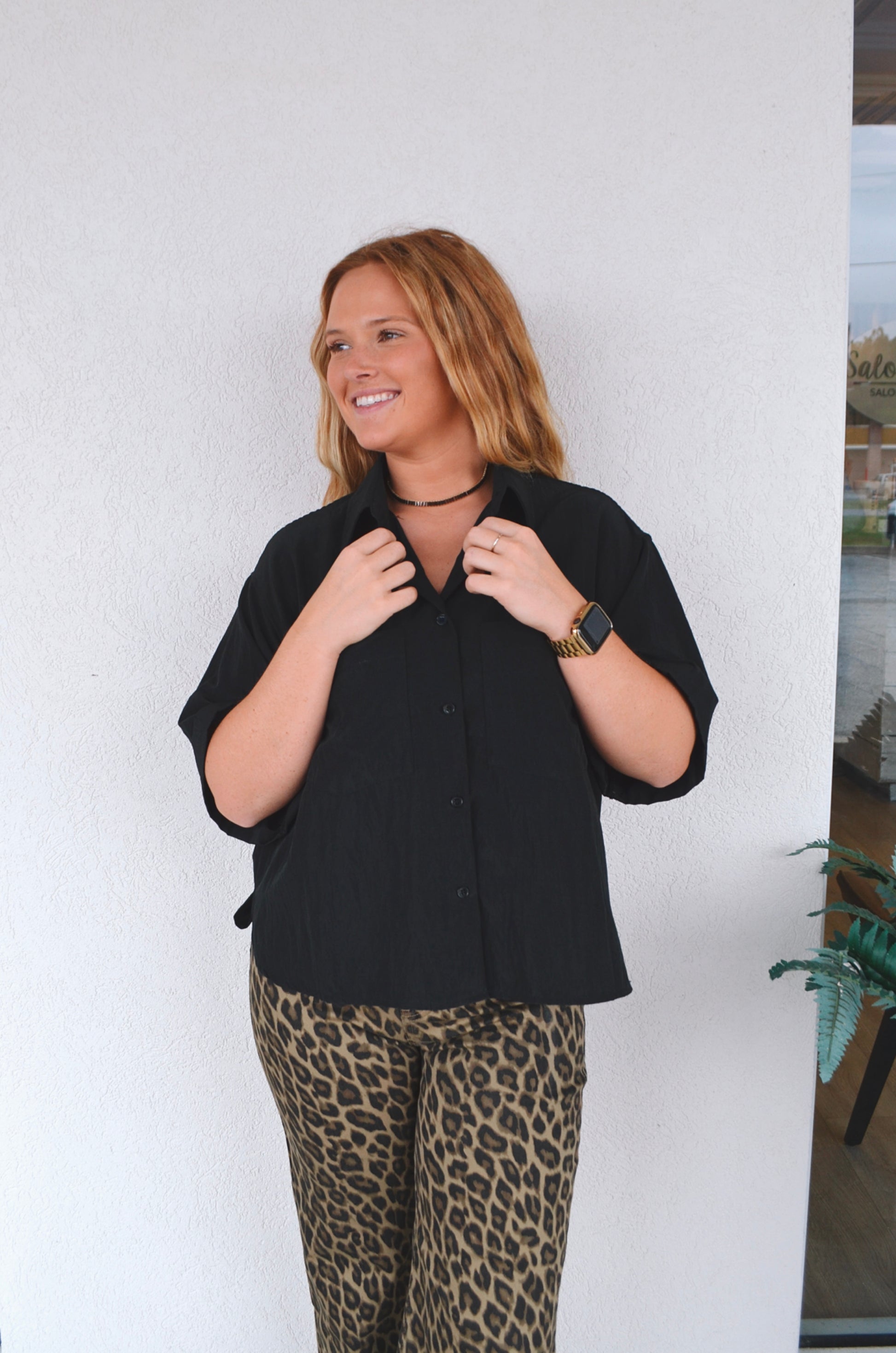 Feels like quality, button-up, top. This textured shirt has a collared design and is effortlessly chic. Boxy in shape and doesn't cling to the body. Features a rolled sleeve that is stitched in place and front pockets.