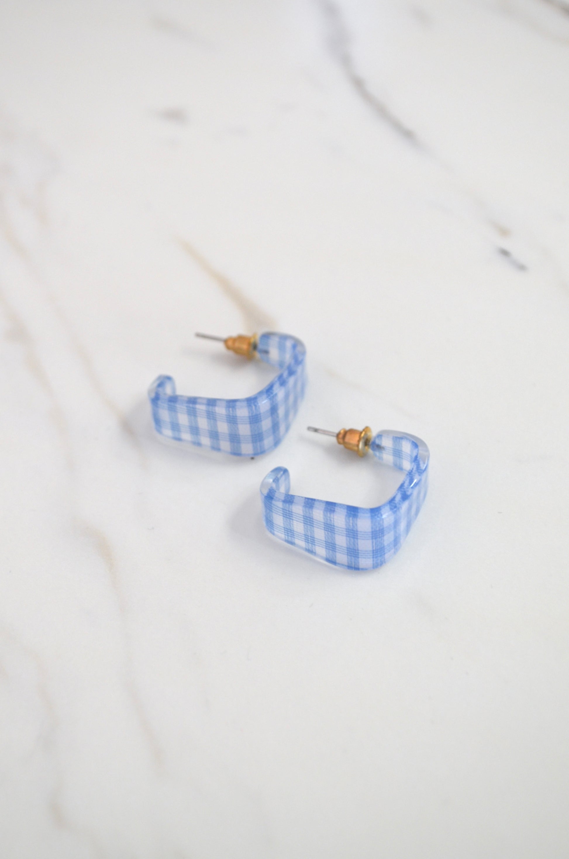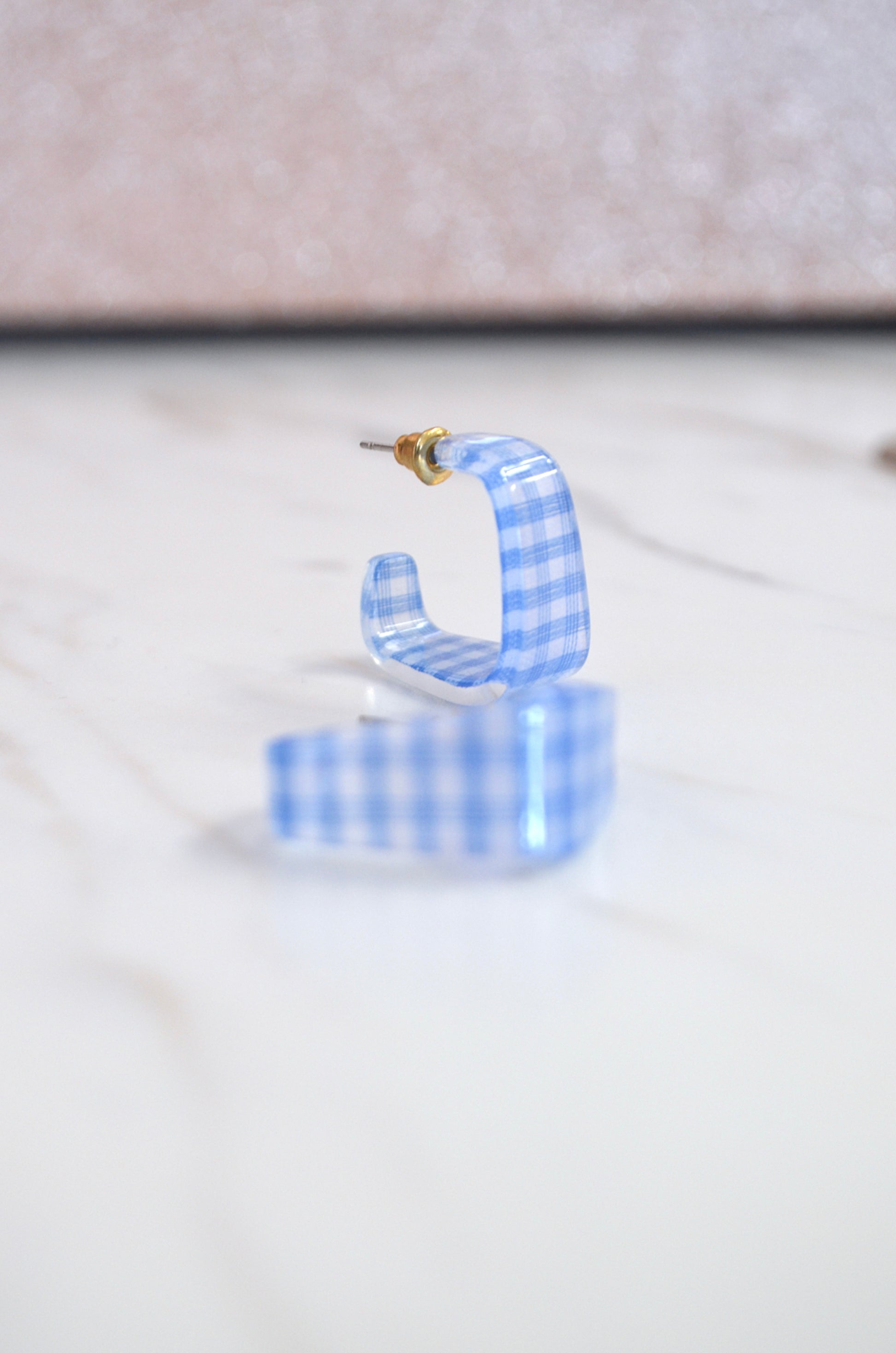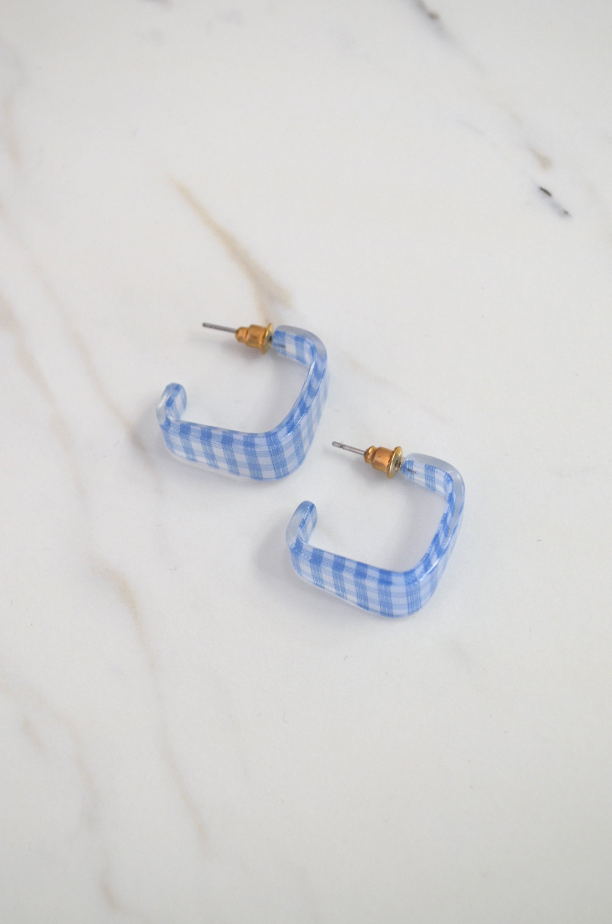 Picnic plaid, square-shaped, hoops. These small earrings are lightweight and made from an opaque acrylic material. Light blue in color and great for adding a little pop to an outfit.