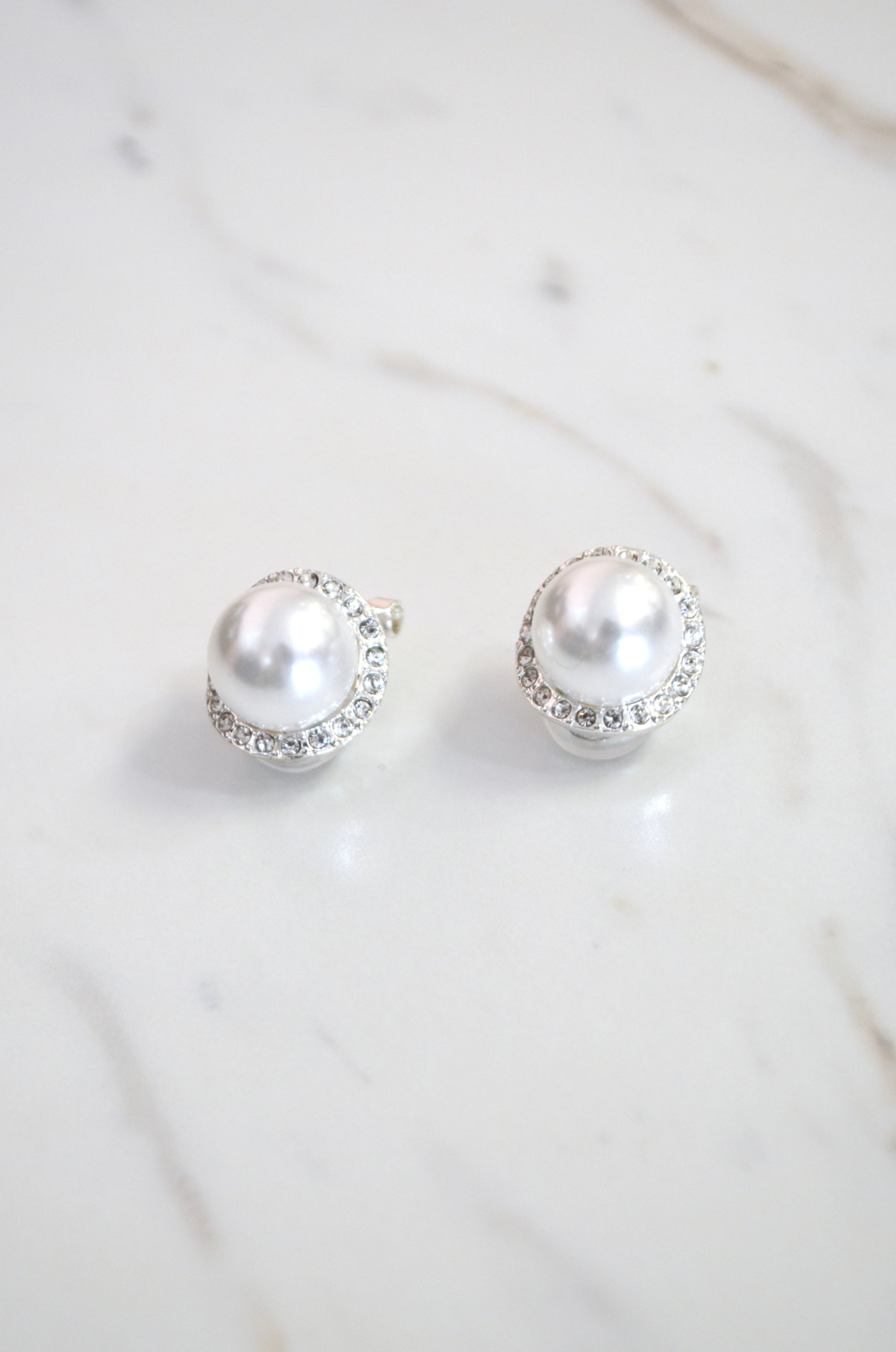 Simplistic and chic, rhodium, pearl, clip-on earrings. Lightweight design with a pave detail encasing the faux pearl.