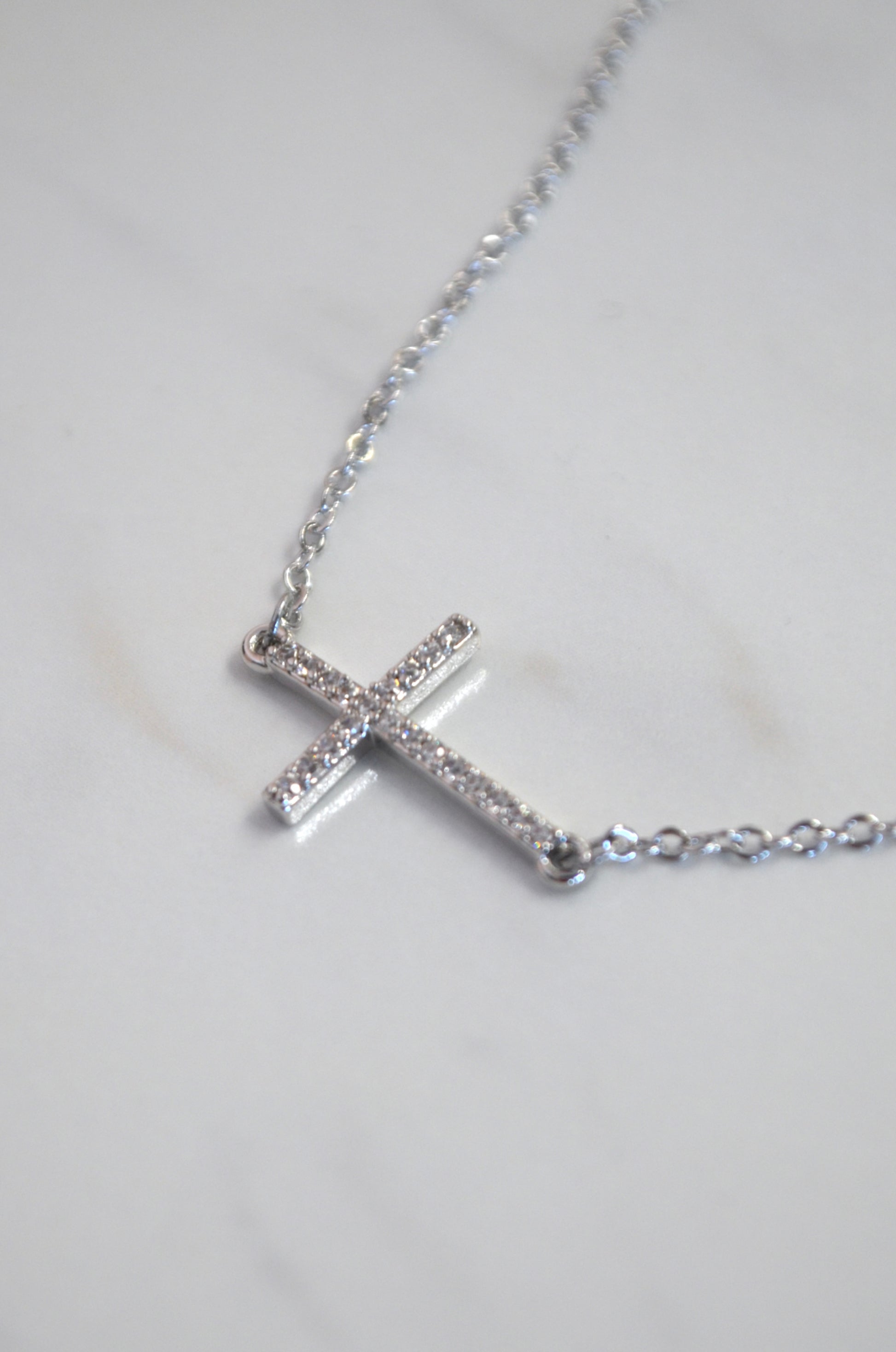 Cubiz zirconia, pave, sideways cross necklace. Short in length and on a delicate and dainty chain. Features a traditional lobster clasp closure and about 3" of adjustable chain length.