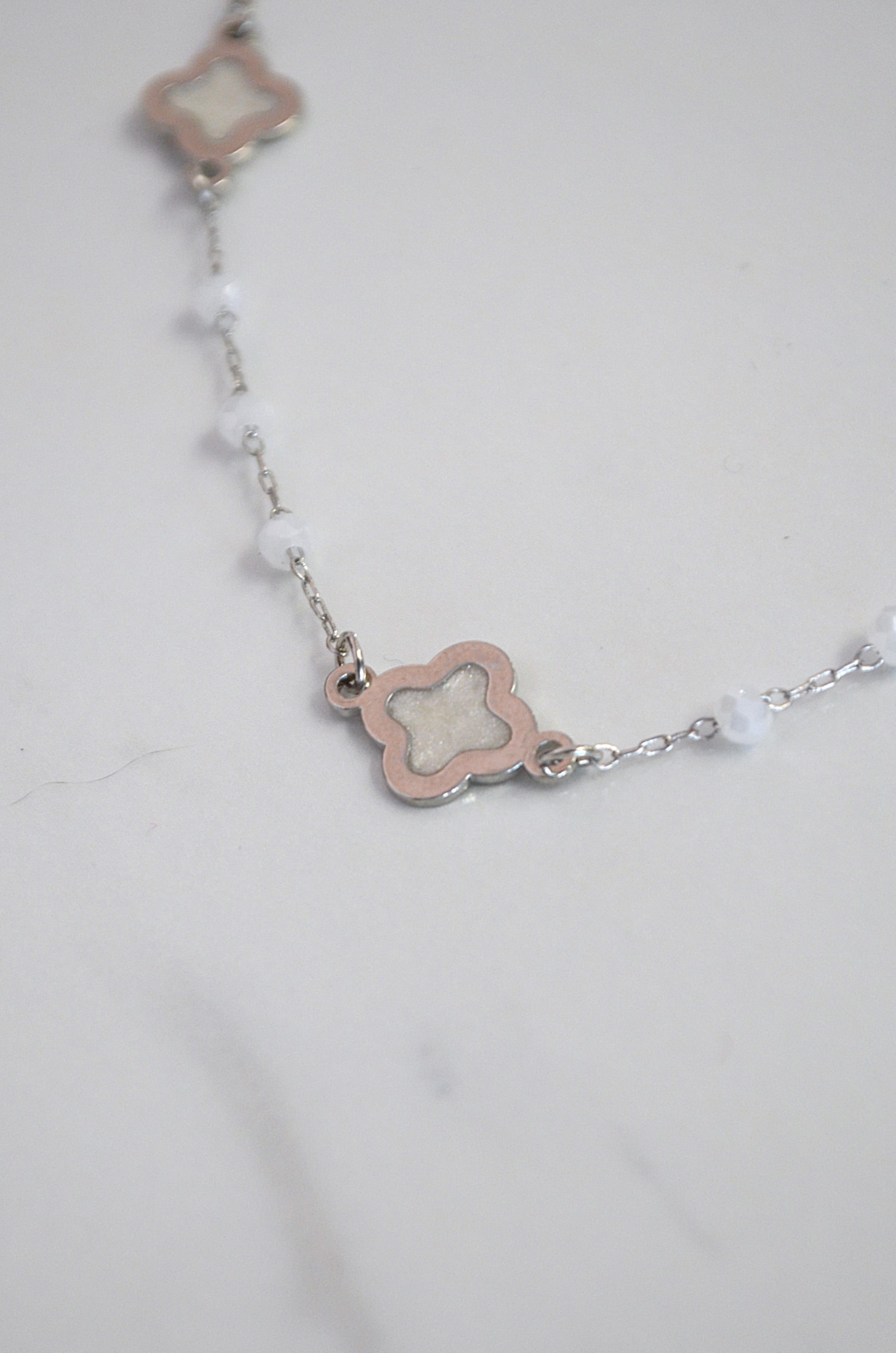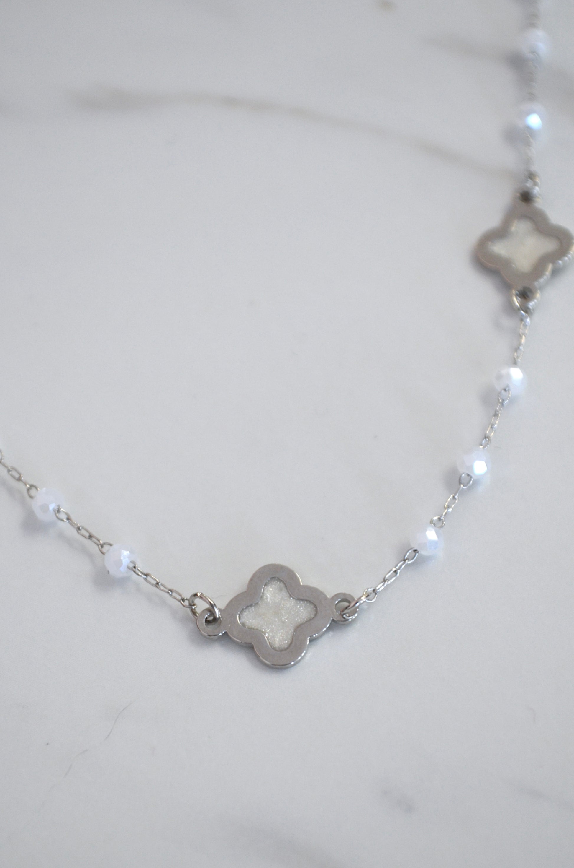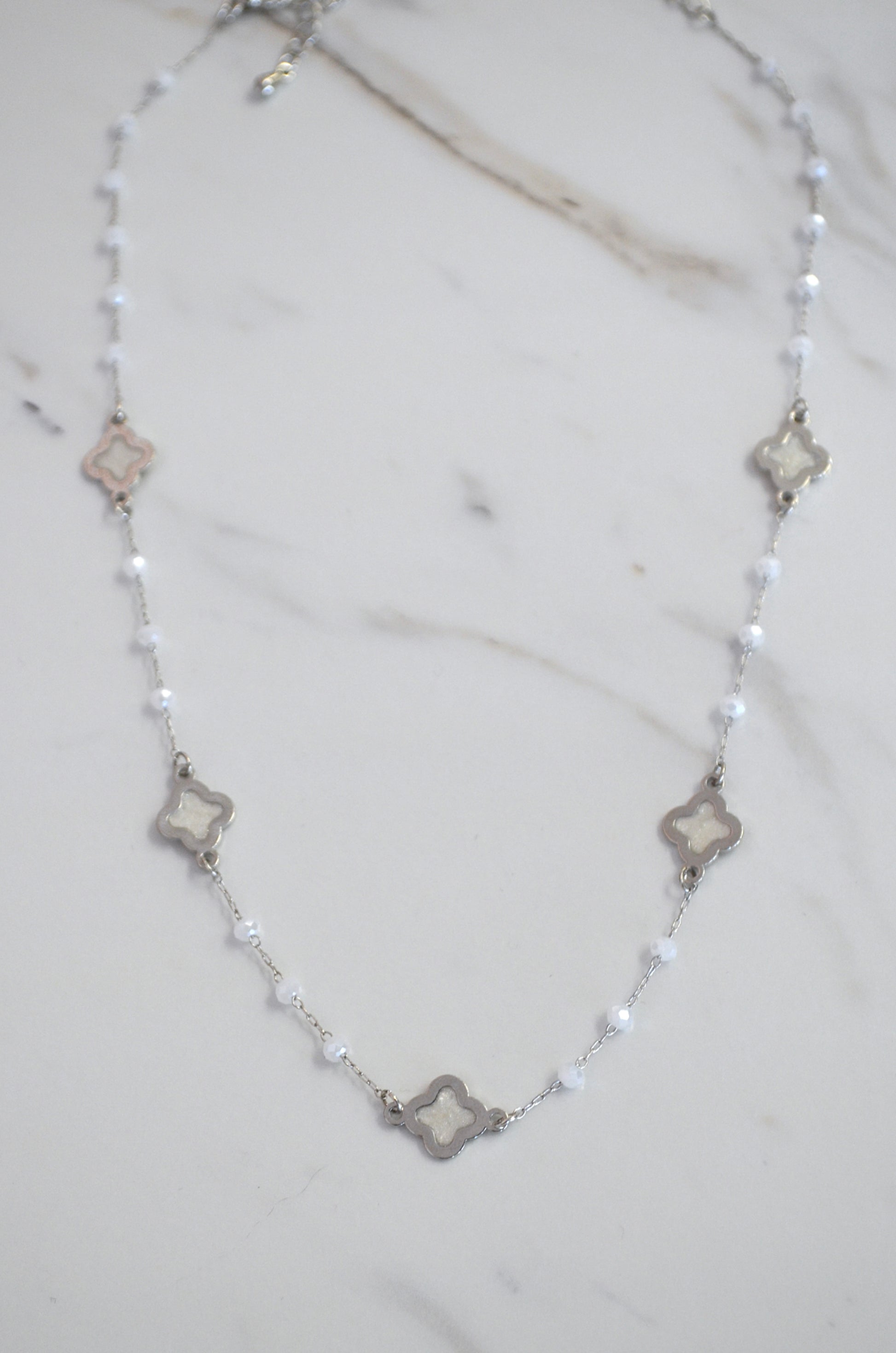 Chic and dainty clover necklace. The thin, metal, chain has tiny faceted beads scattered along it. Mother of pearl inspired clover design elevates this simplistic accessory. Short in length and features a lobster clasp closure. This necklace has 2" of extension chain for minor length adjustments.
