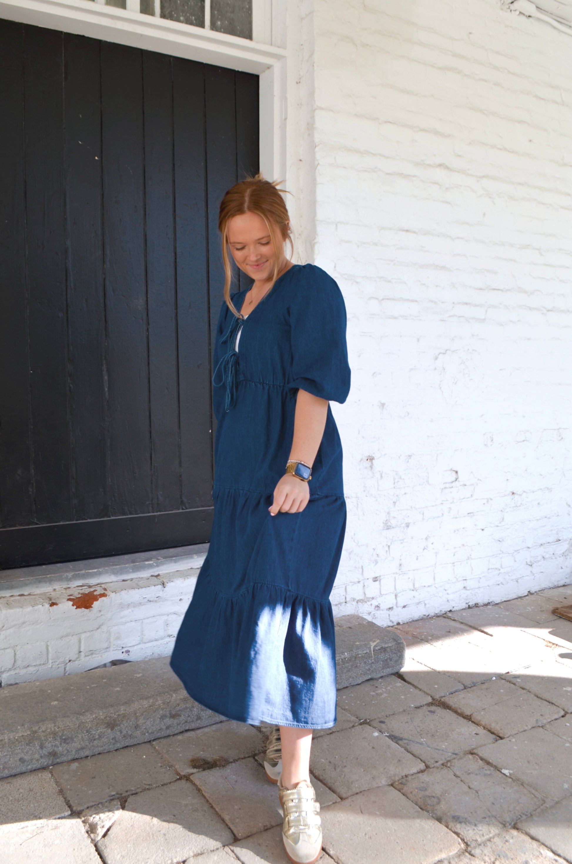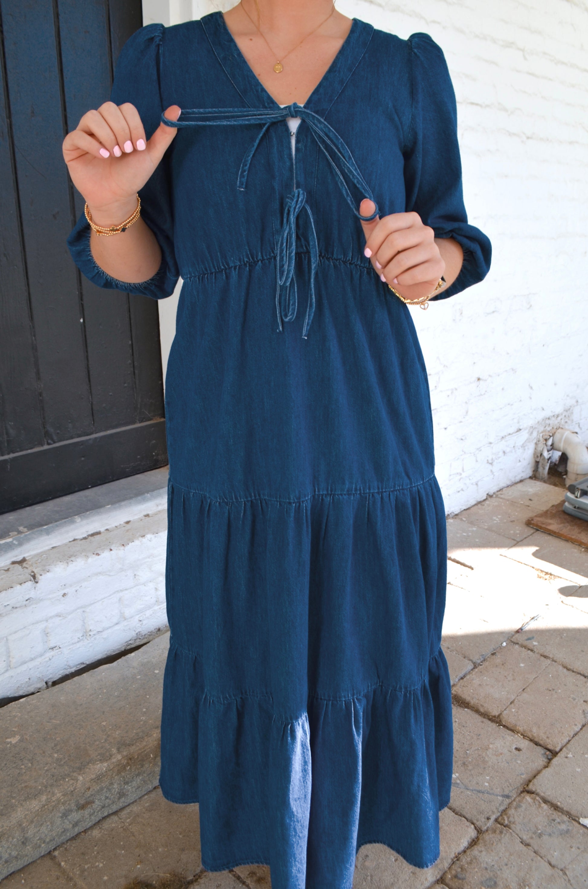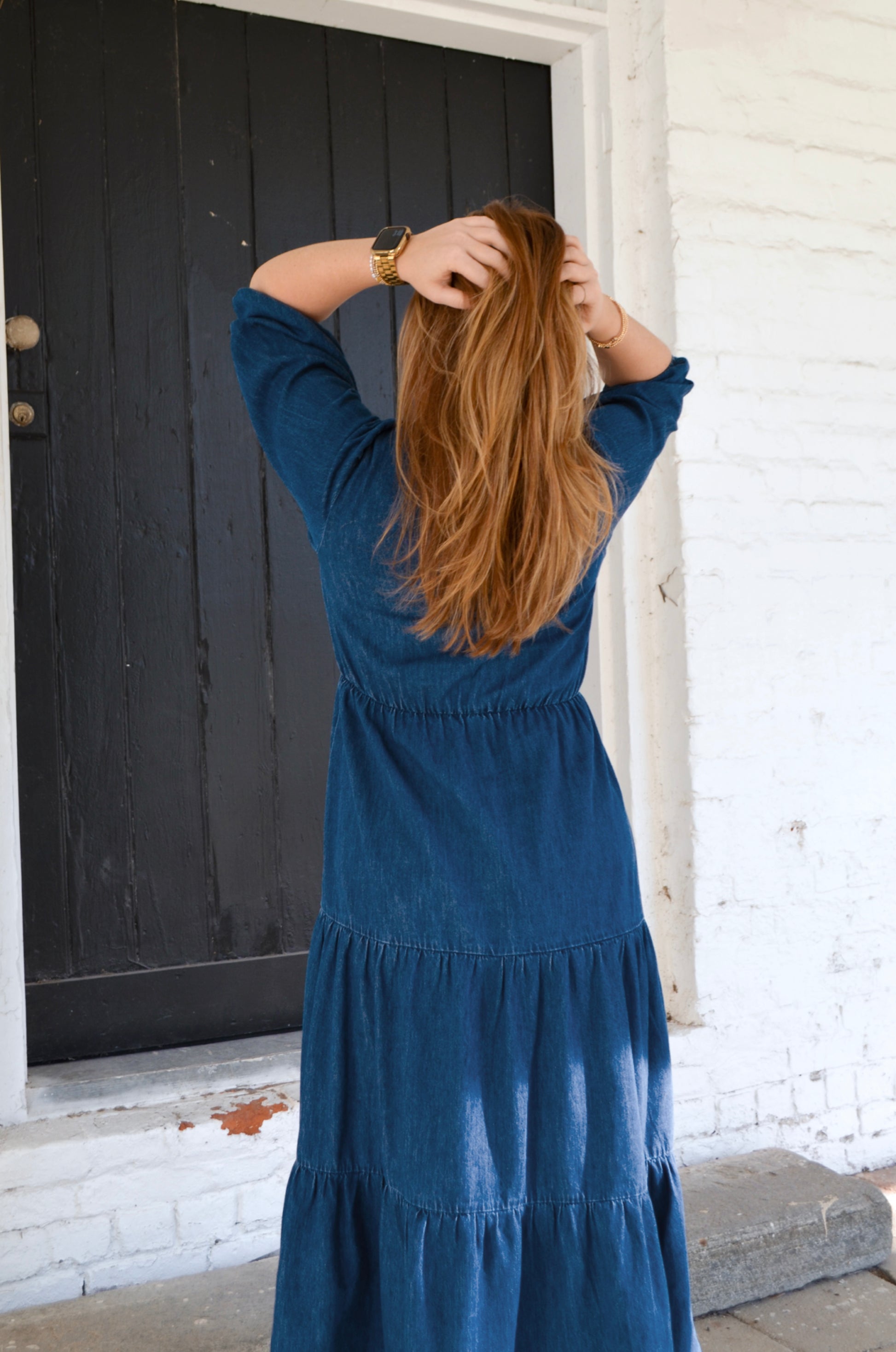 A staple piece for your closet! This 3/4 sleeve dress has a gorgeous, tiered, design. Made from a lightweight denim material that is a medium/dark wash. It features a double tie-front detail that can be adjusted as well as a hook-and-eye closure for extra coverage. We opted to wear a bandeau under for a more modest appearance.