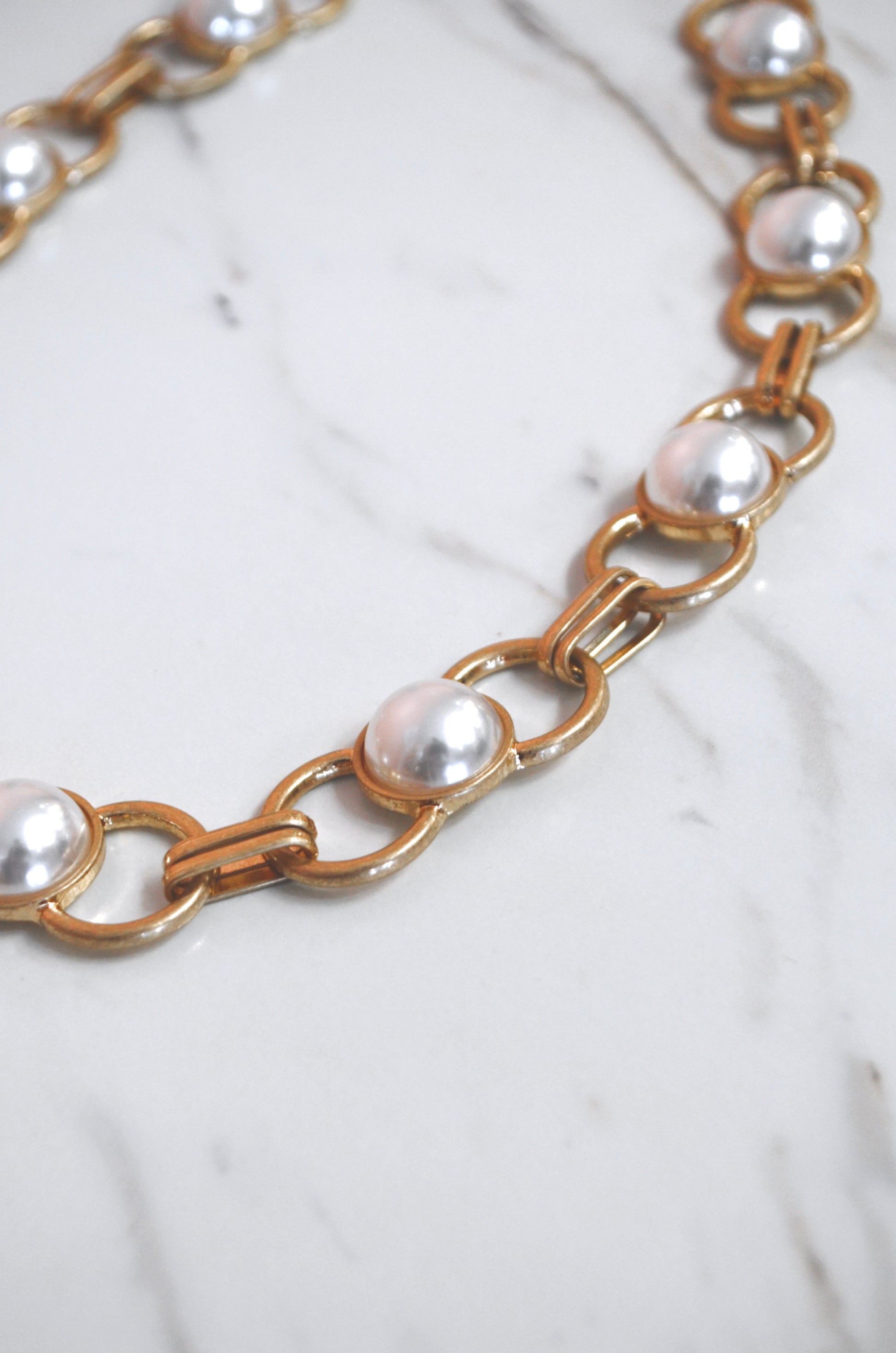 Chunky and gaudy, statement, necklace. This large faux-pearl detail accessory has a hollow 'linked' chain design that is chic and intricate. Worn golden metal design that has a luxurious and vintage appearance. It lays flat and features a lobster clasp closure and extension chain.