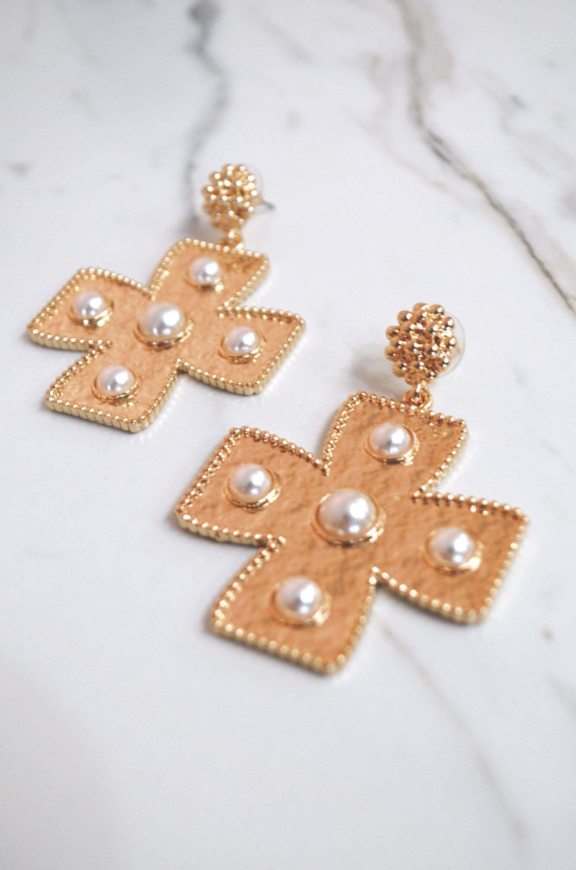 Jumbo, byzantine inspired, statement earrings. This cross accessory has a post-back design that sits securely in the earlobe. Made from a textured, golden, metal and it features faux-pearl details on the surface. These chic earrings are great for dressing up an outfit or polishing off a themed outfit.