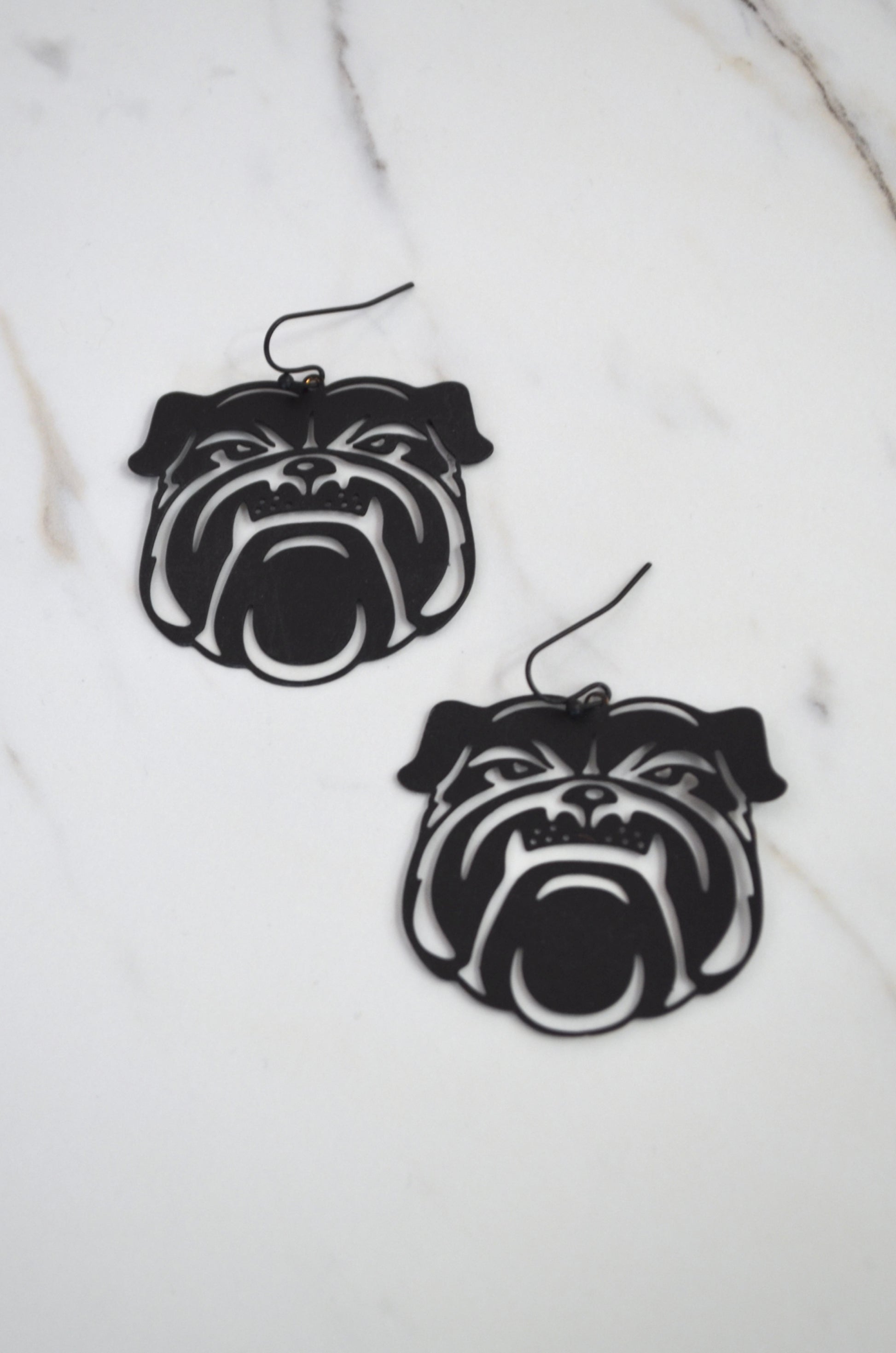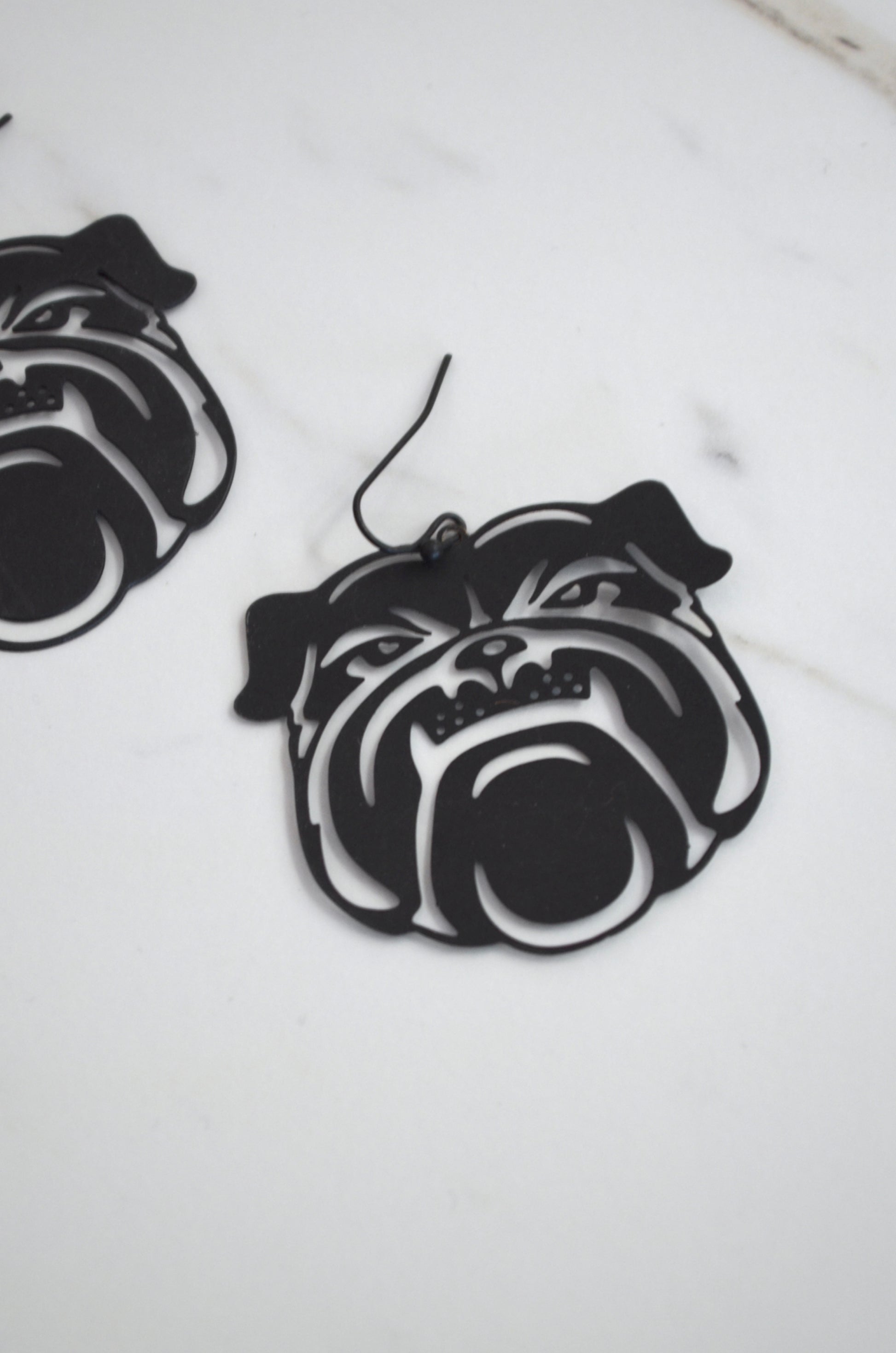 Large, metal, filigree, DAWG earrings. Inspired by the UGA Bulldogs, these earrings have a cut-out design and a dangling structure. Extremely lightweight and thin with a fish hook closure.