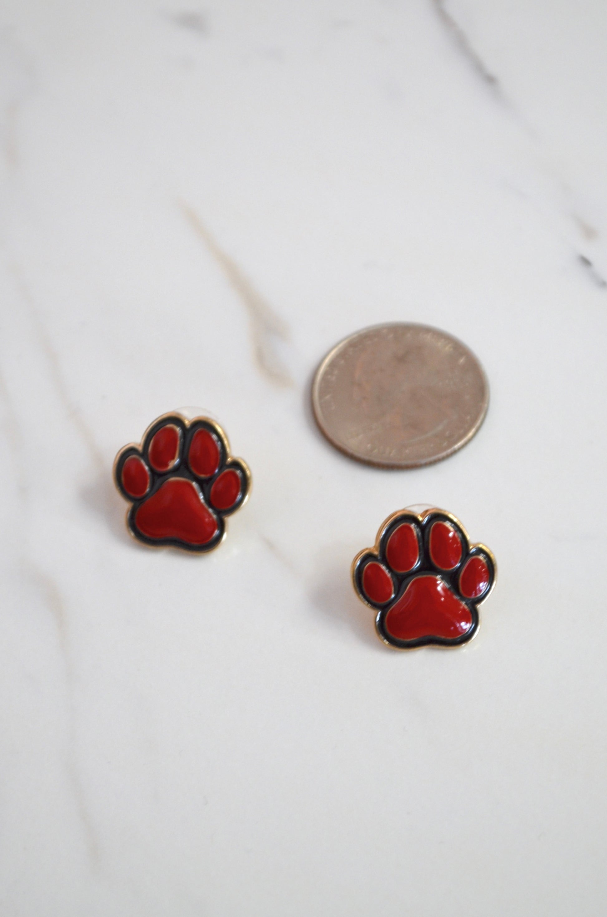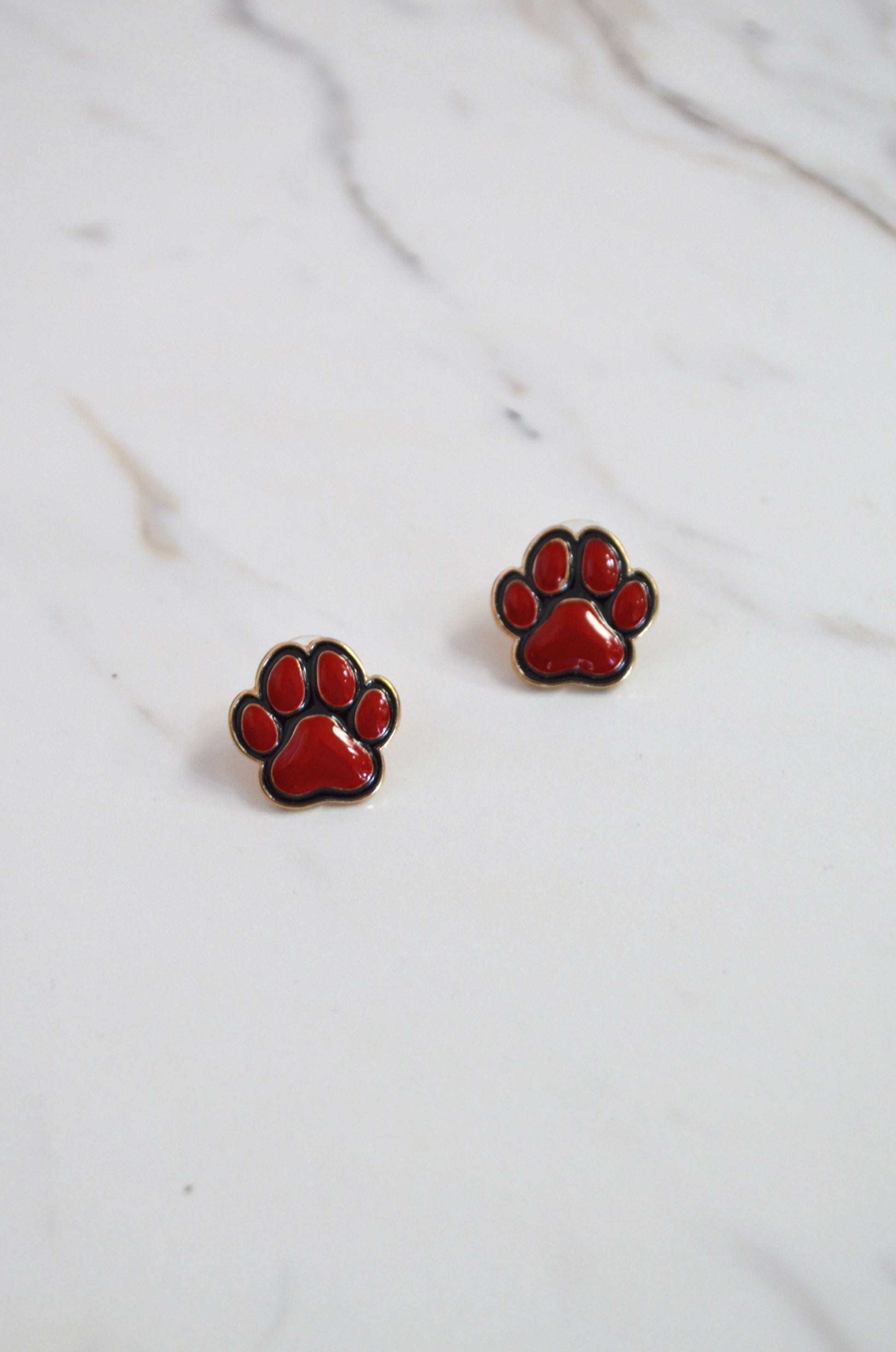 Small and detailed, golden, stud earrings. Formed into a smooth paw-print and features a sleek colored coating along the top. Perfect for our UGA fans and lightweight enough for all ages.