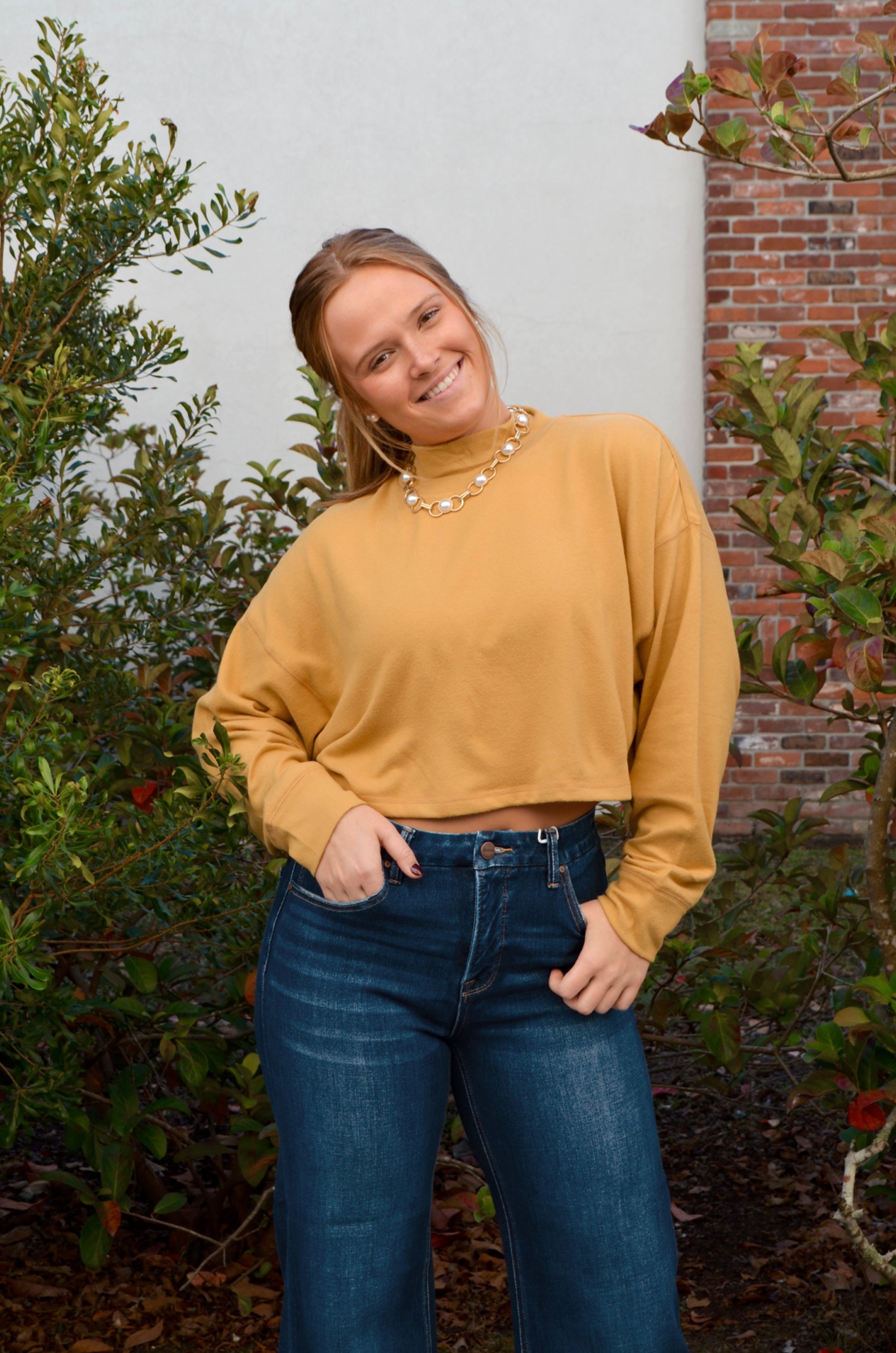 Our lightest and softest mock-neck yet. This shirt is cozy like a sweatshirt but light as a tee. Ultra-cropped hemline and a boxy silhouette adds to the casual appearance of this shirt. Vintage inspired, golden, mustard in color.