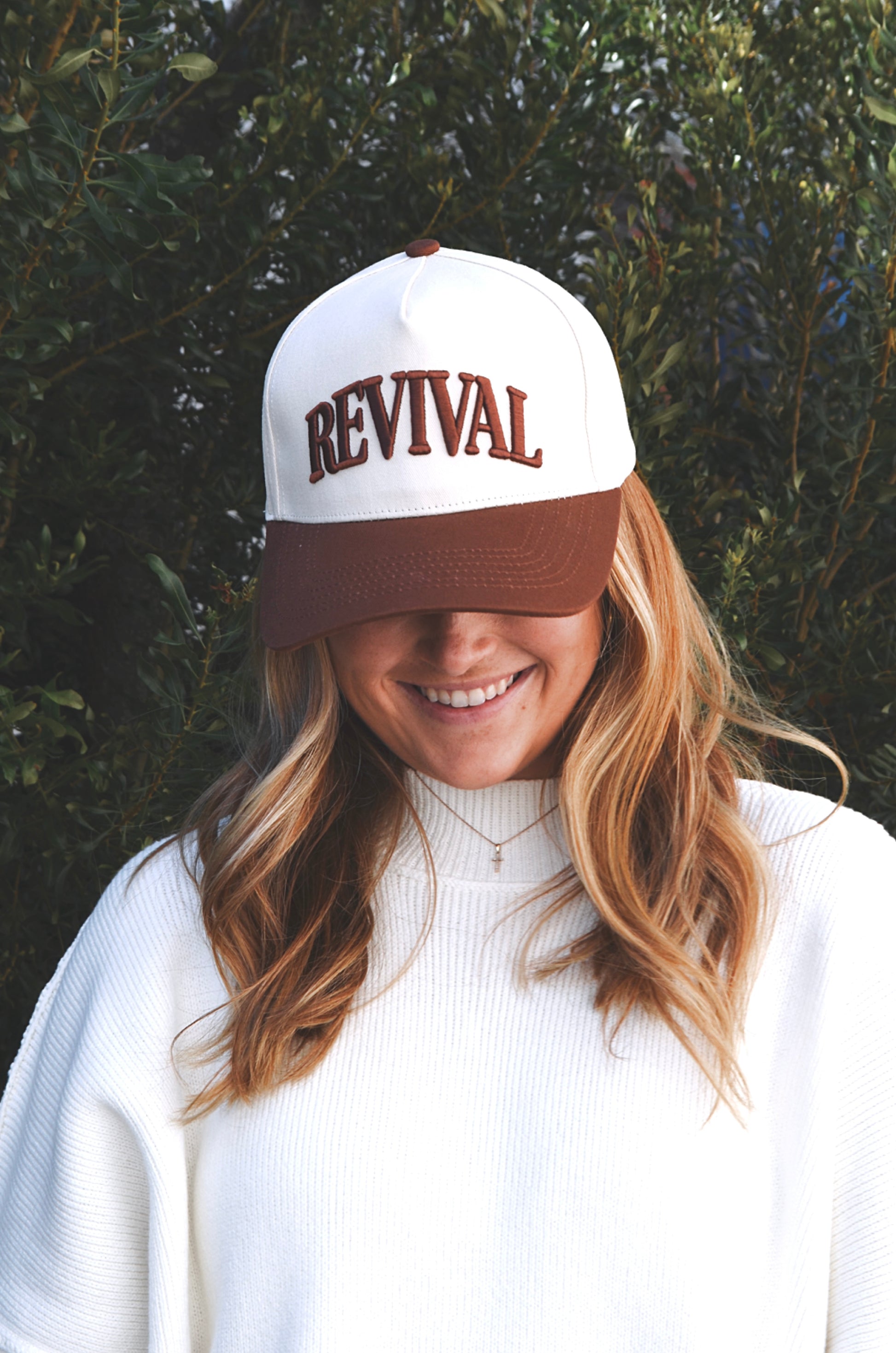 Statement trucker hat with "REVIVAL" embroidered design. Double-embroidered letters have a risen and luxurious appearance. Snapback closure allows for easy adjustments.