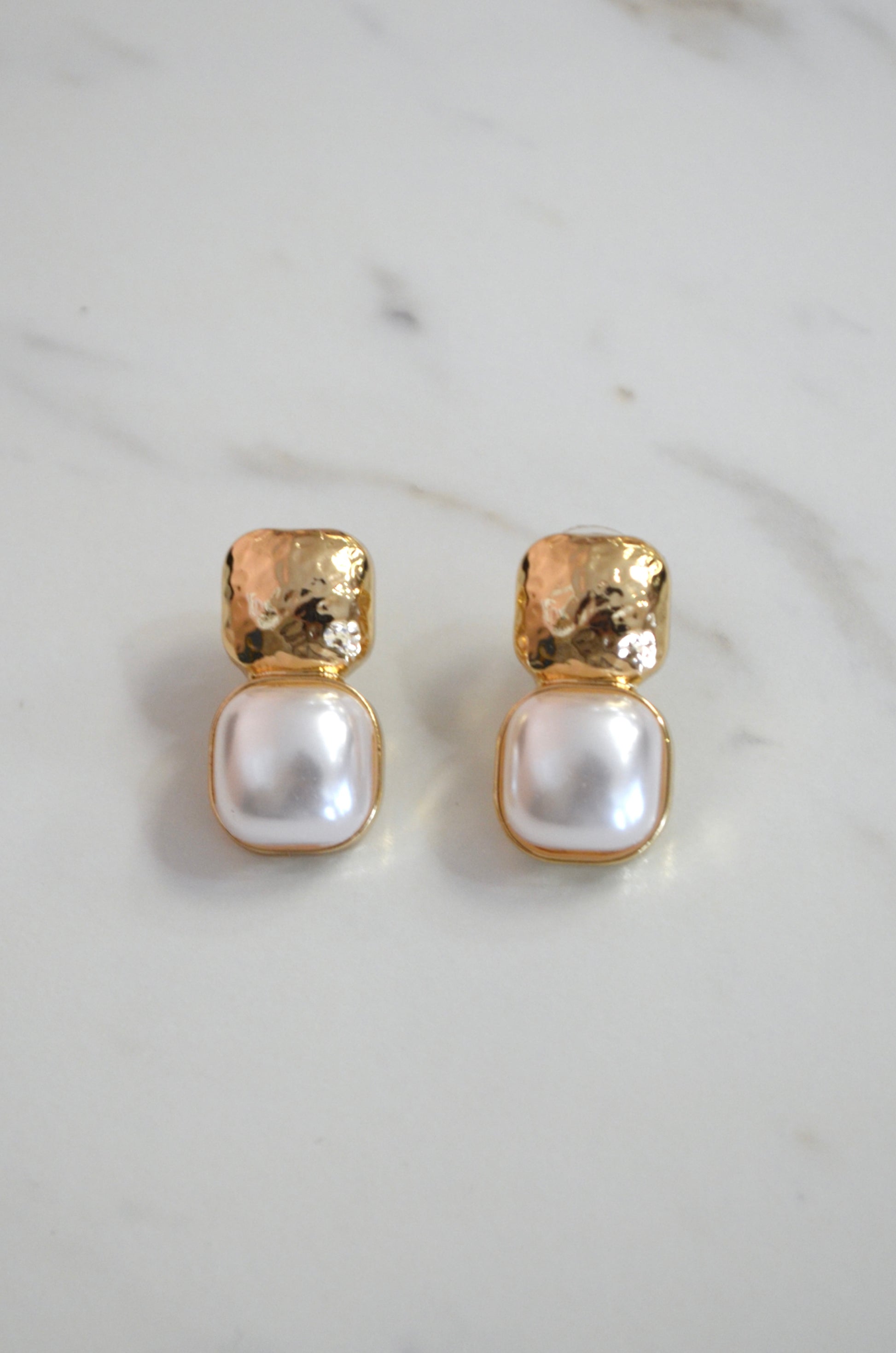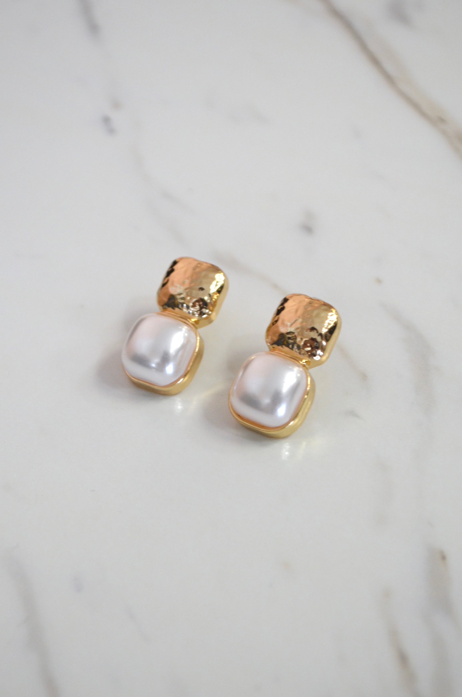 Small, golden framed, faux pearl earrings. These stud earrings are small in size and lightweight. They feature a texturized design on the top and a smooth surface on the bottom. Chic and elegant design that is easy to style for everyday wear.