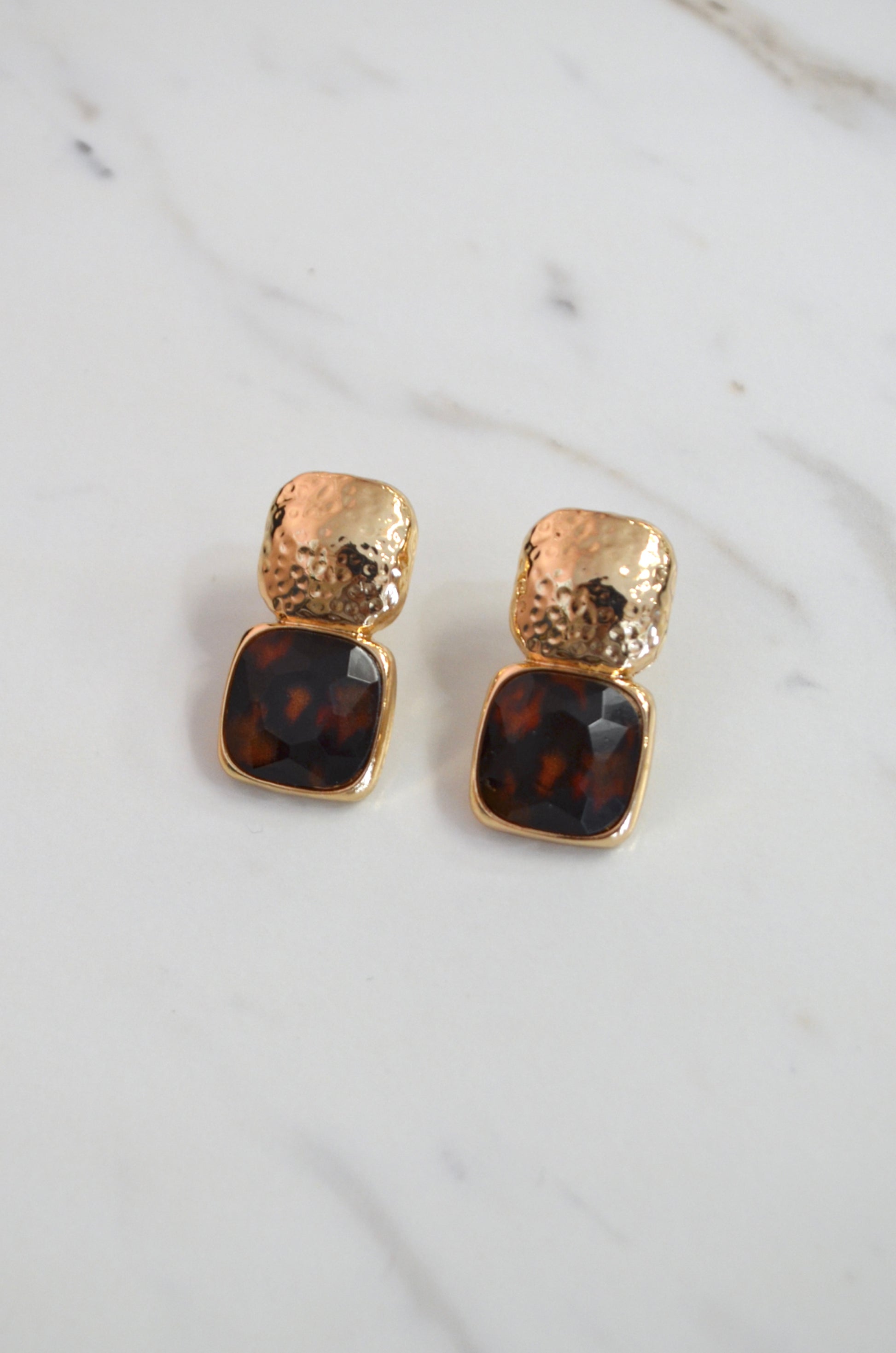 Chic, 'old money' inspired, beveled stone, earrings. These studs have a post-back design and they are small in size. Golden in color with a statement tortoise stone at the center. A texturized detail can be seen on the top half of these studs.