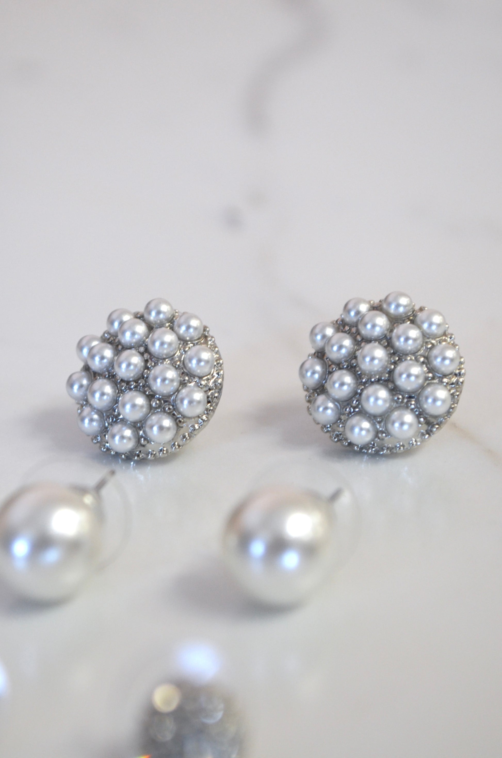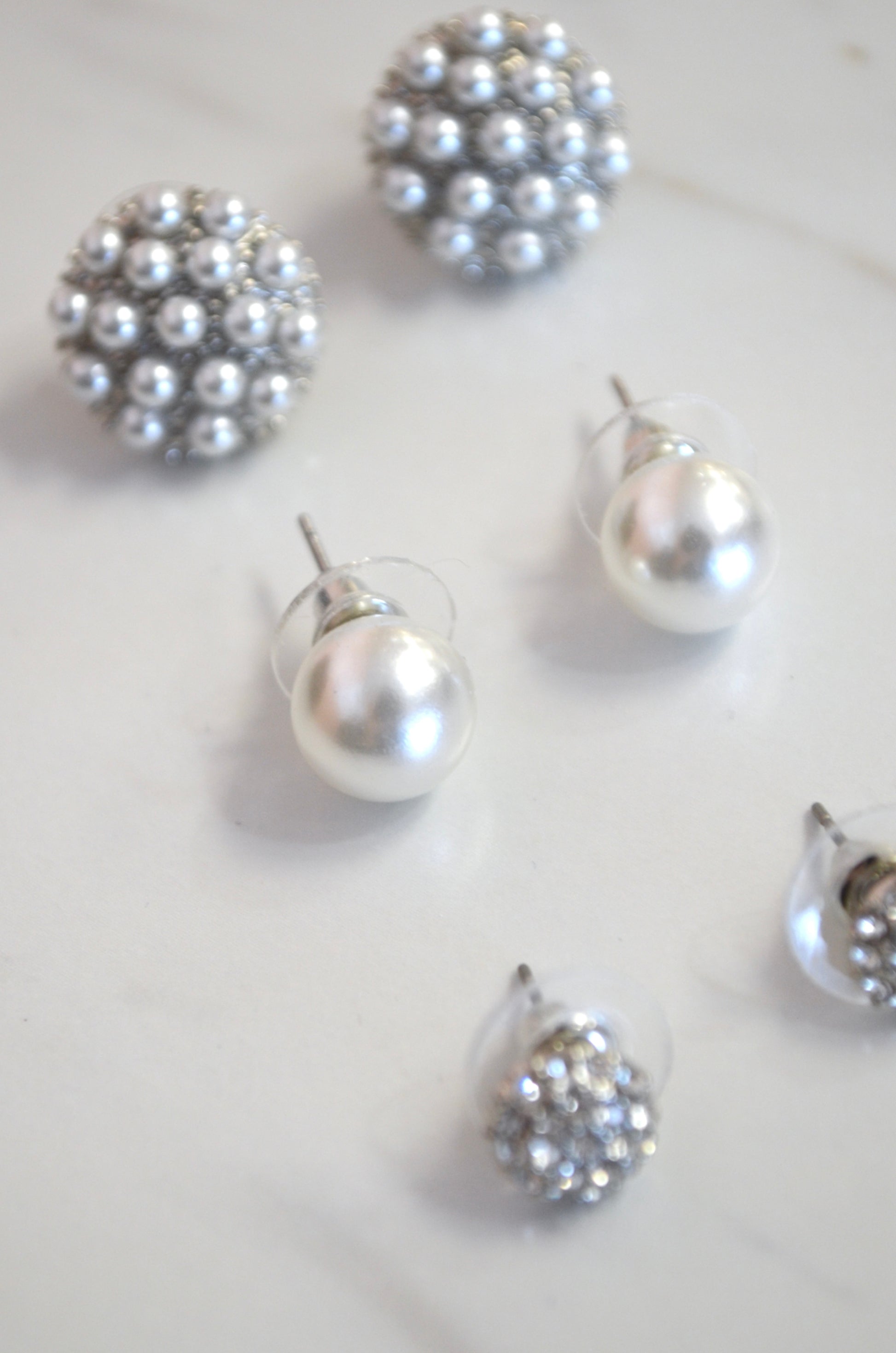 3-piece, faux pearl, earring set. Stud back earrings made out of a rhodium metal. All 3 pairs are small in size and great for casual days or dressier ones.