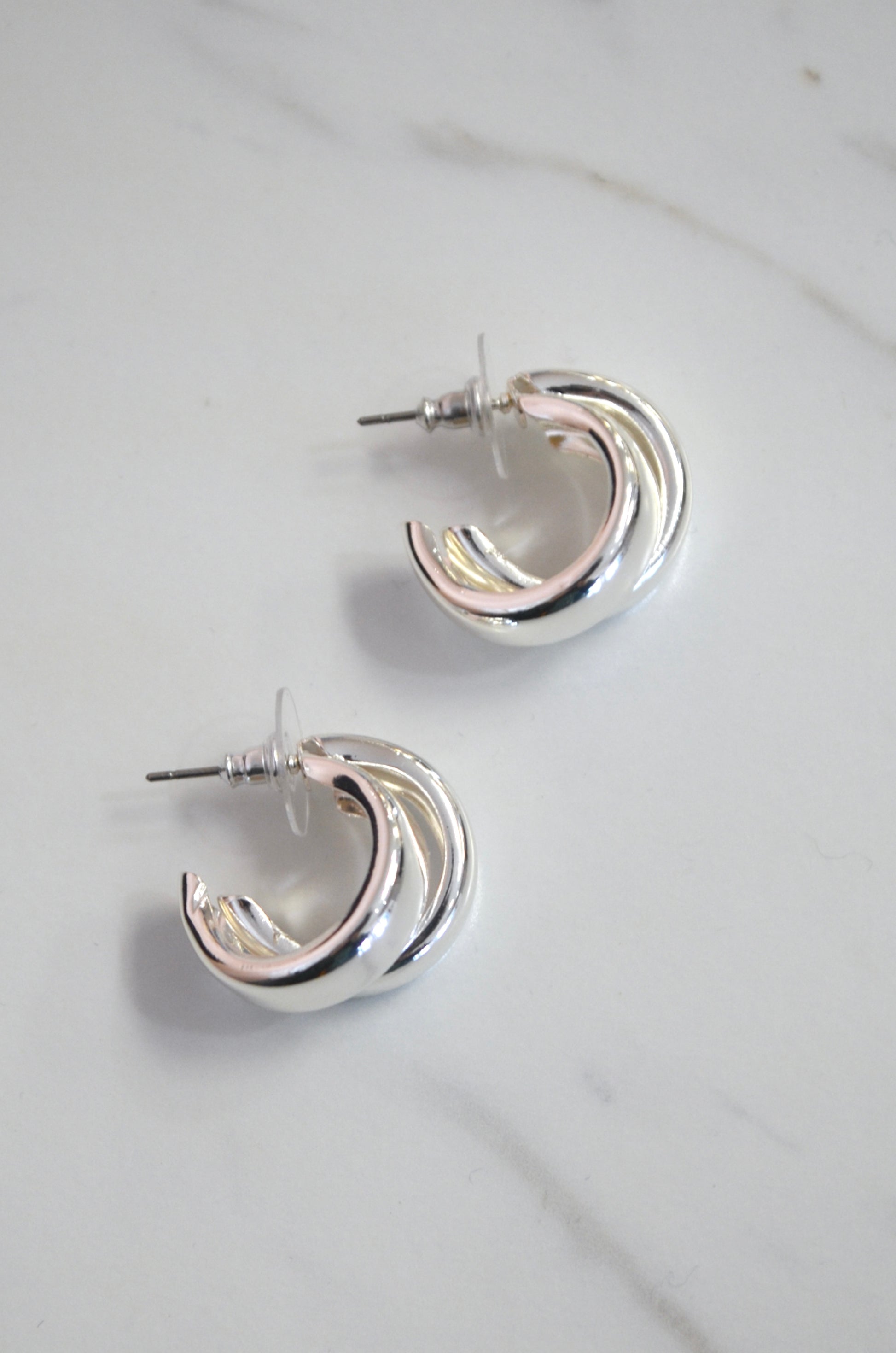 Small, chunky, half-hoop earrings. These shiny and smooth earrings have a double-hoop appearance and design. Post-closure makes this style easy to apply and take off. Mid-weight design feels luxurious.