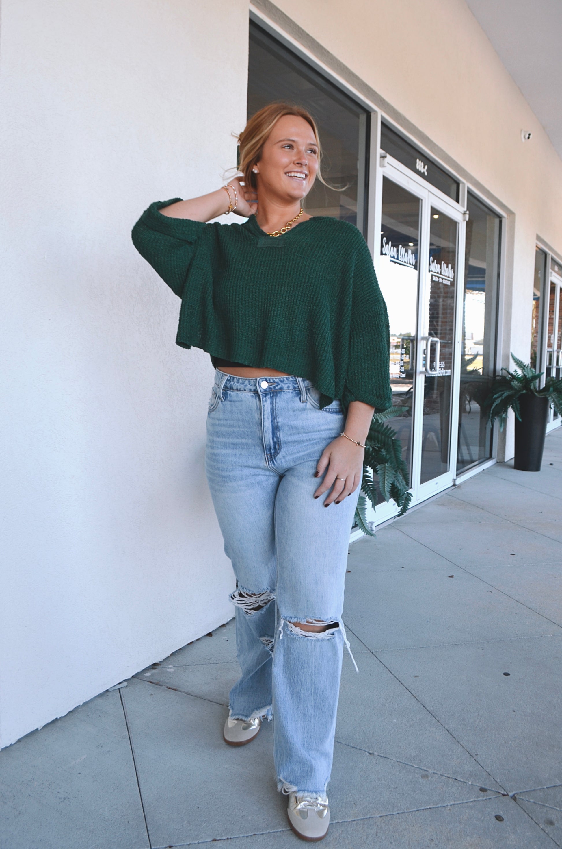 Cropped, 3/4 sleeve, notch-neck, sweater. This trendy and LOVED top has a slouchy fit and boxy silhouette. The wide sleeves are relaxed and have a drop-shoulder appearance. Rolled sleeve detail is stitched into place. This is a mid-weight knit that is perfect for all seasons of the year.