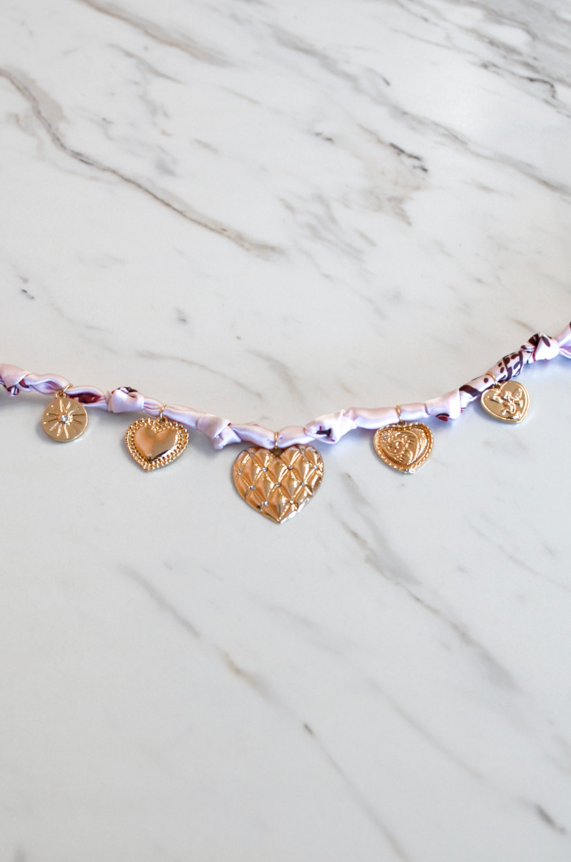 Trendy, golden heart charm, scarf necklace. This statement accessory is easy to apply with a lobster clasp closure at the back and about 3" of extension chain. Thin, knotted, scarf in a baby pink color and vibrant golden charms.