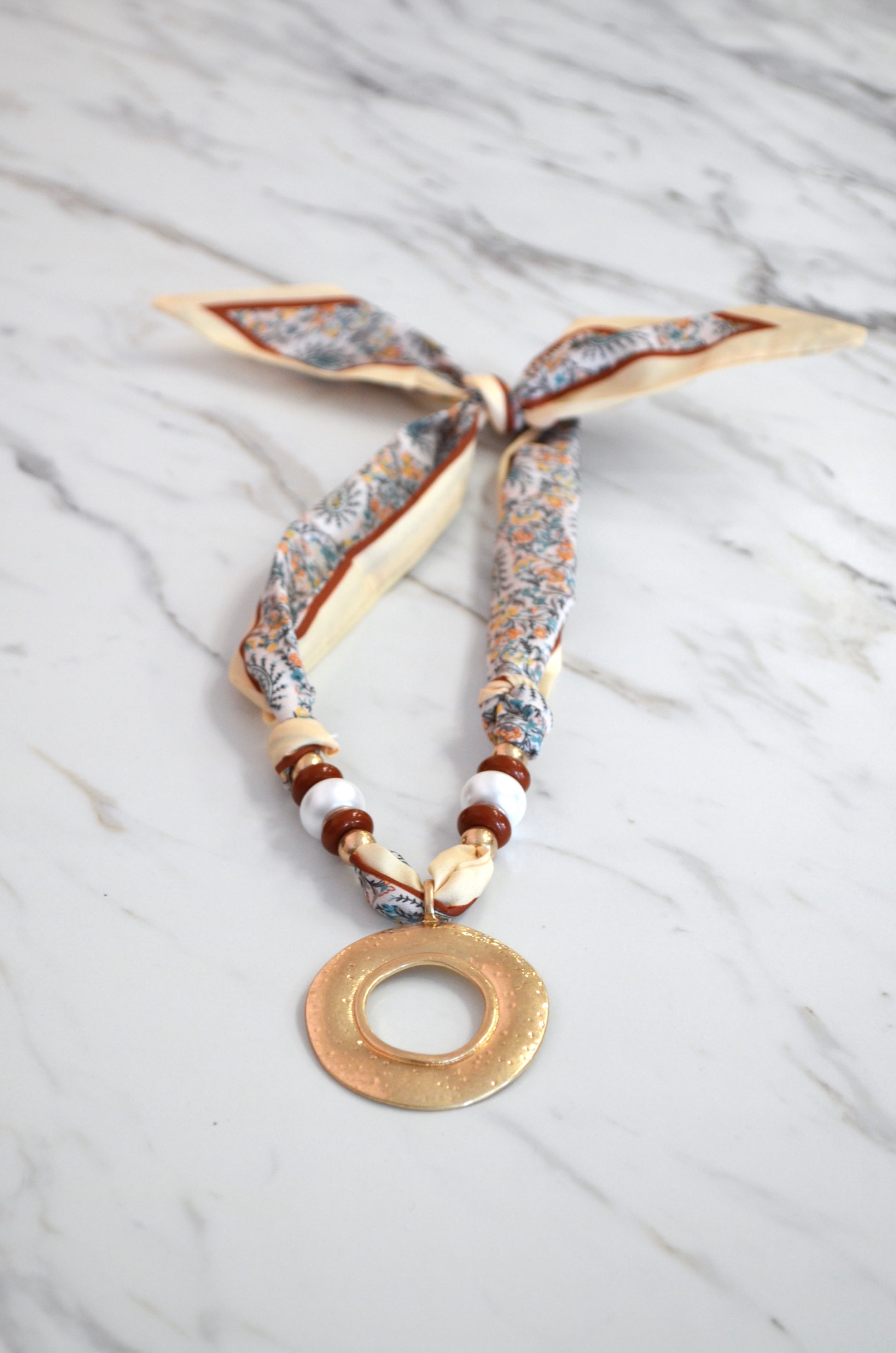 Dress up any simplistic style with this hic and trendy, short, scarf necklace. Large rounded pendant design with a textured, golden, surface. Beaded accent details can be seen towards the pendant. Simply tie your scarf at the back of your neck to secure. This accessory is short in length and is meant to be worn as a statement necklace.