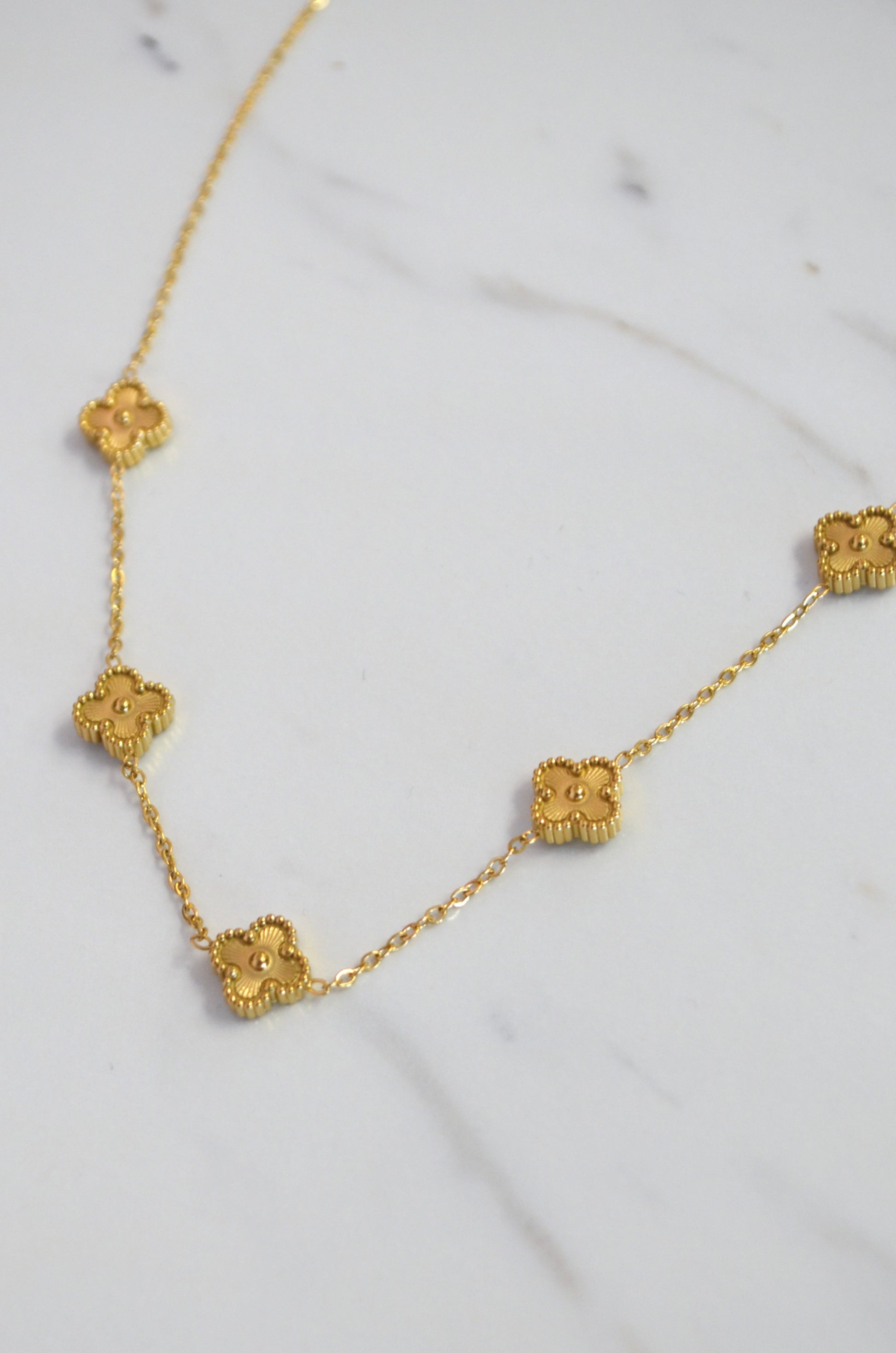 Chic, 5-clover, gold-dipped necklace. This classy and sophisticated necklace has a modern and simplistic design. Dipped in K18 gold and made from on a thin chain. It has 2" of extension chain for minor length adjustments as well as an easy-to-use lobster clasp closure.