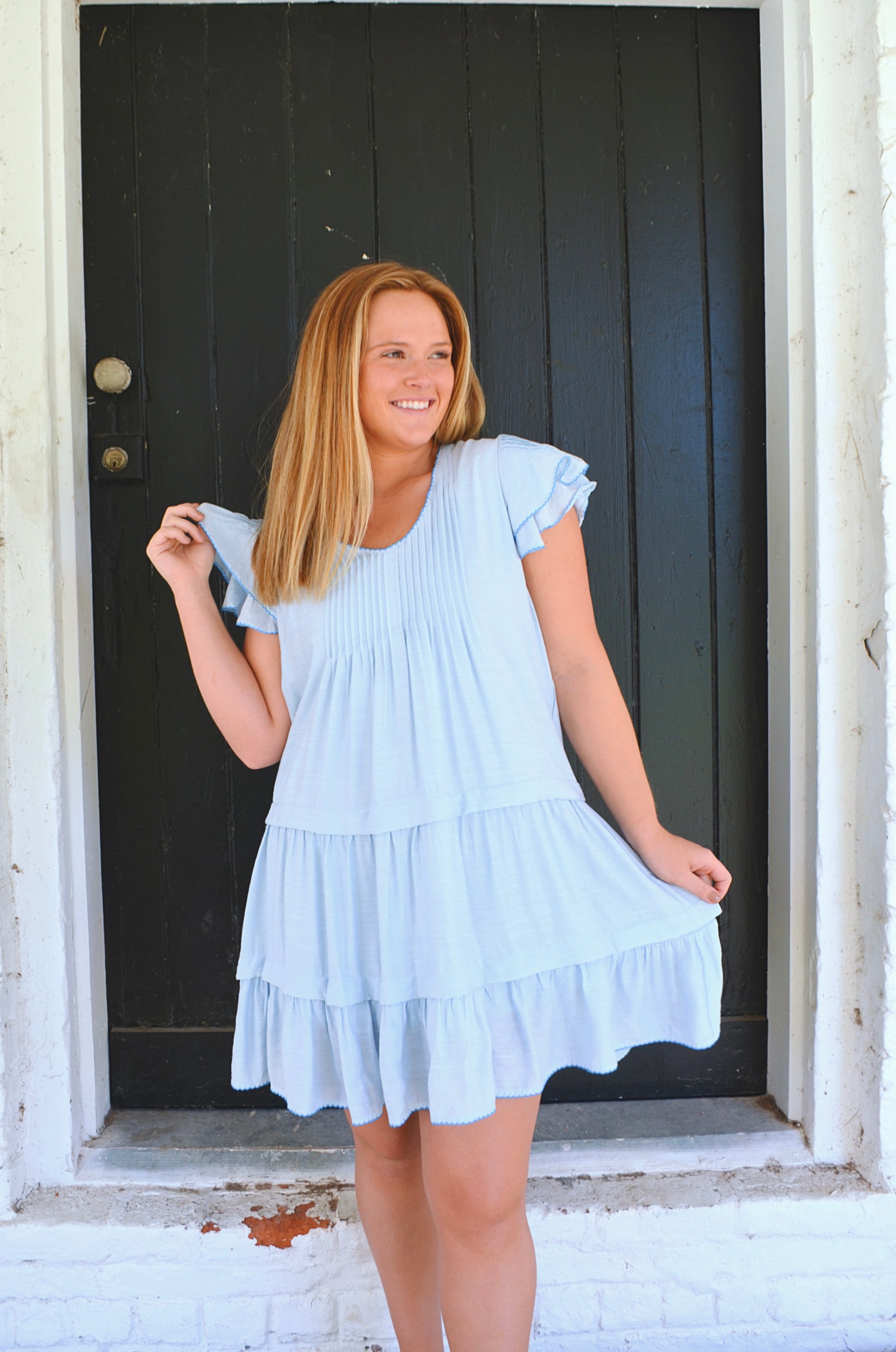 Feminine and modest, baby blue, mini dress. This tiered one-piece has a flutter sleeve that is trendy and preppy. Pleated details along the front create a unique appearance. This dress has a fit and flare silhouette and is meant to hang away from the body. It's length is modest and brushes just above the knees. Made from a smooth and lightweight material that is breathable. Ric-rac trim can be seen along the hemlines of this dress in a deeper shade of blue. The minor detail elevates this simplistic dress.