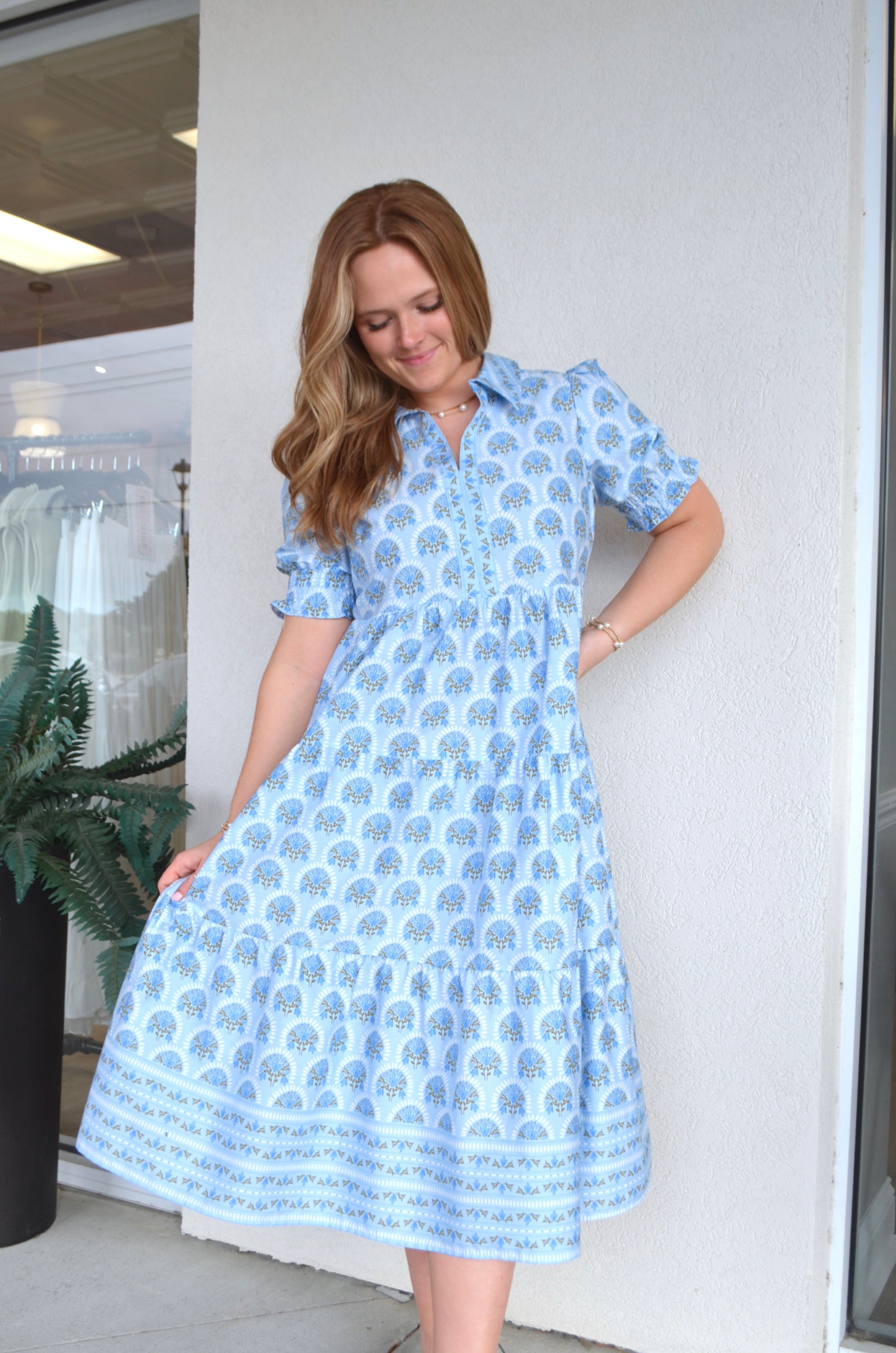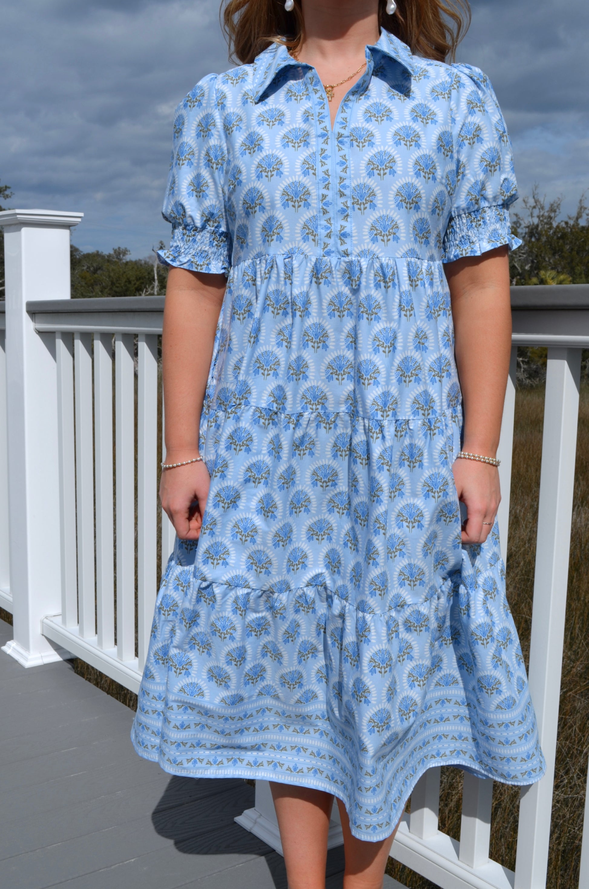 The fold-over collar adds a touch of timeless charm, giving the dress a slightly tailored feel while still staying relaxed. Smocked short puff sleeves bring playful texture and comfort, gently framing your shoulders without feeling restrictive. The flattering midi length and tiered skirt create beautiful movement with every step.