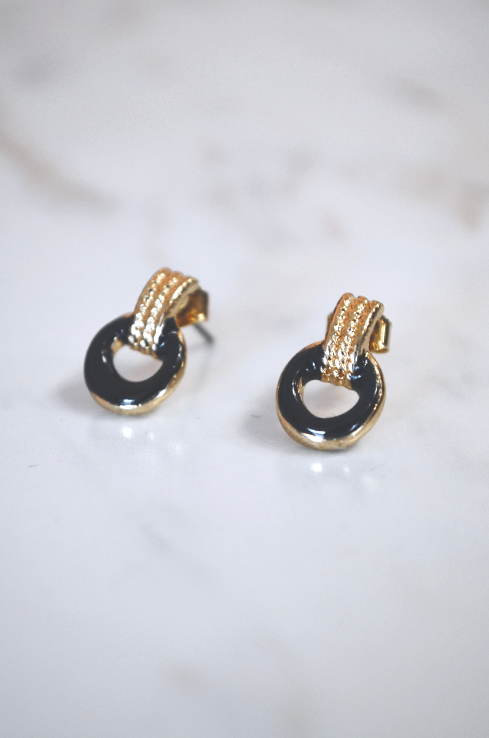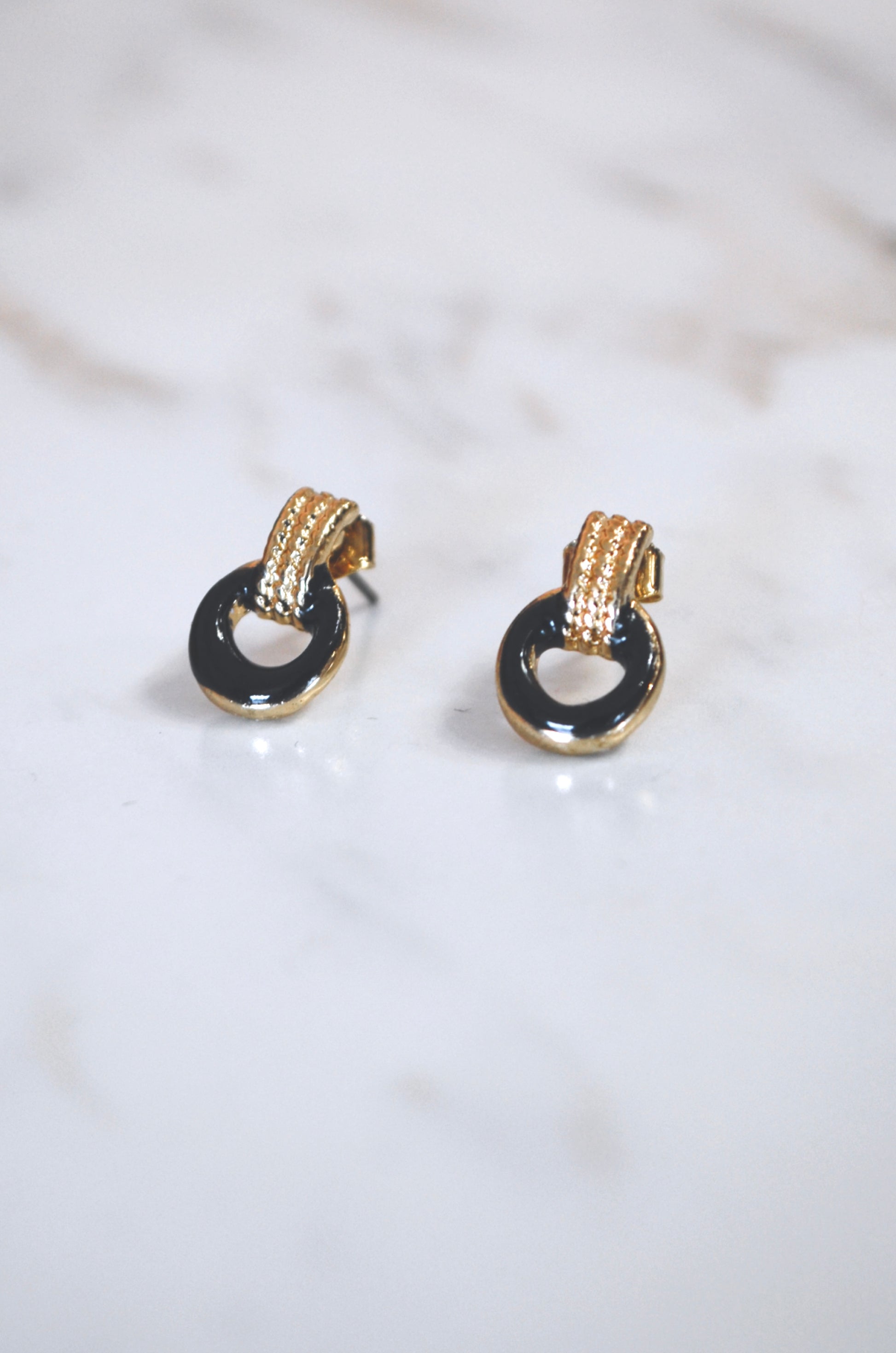 Dainty and chic, golden, door-knocker, earrings. This stud back design has a textured detail towards the top and a color dipped detail at the bottom. Perfect for smaller or sensitive ears.