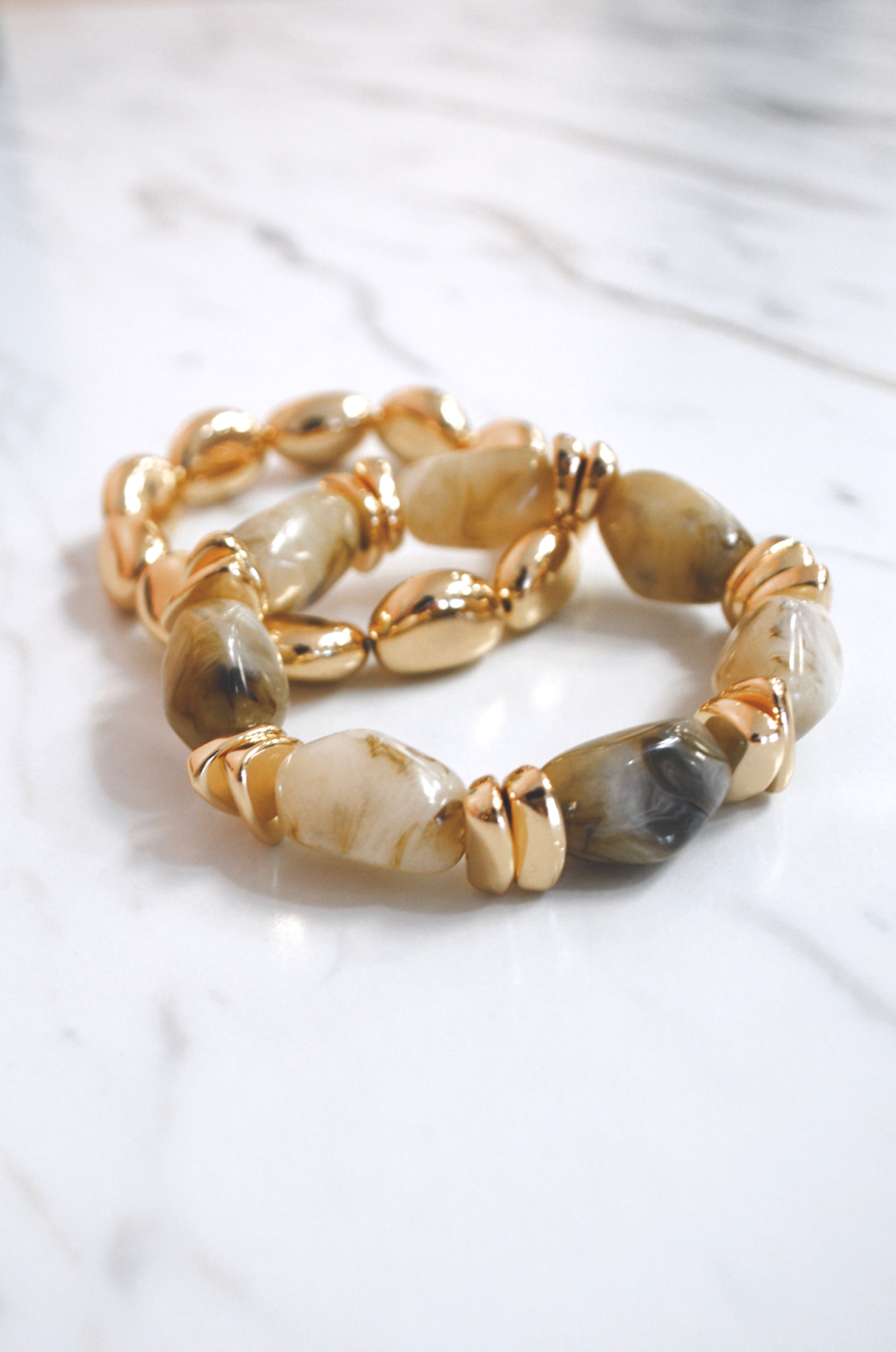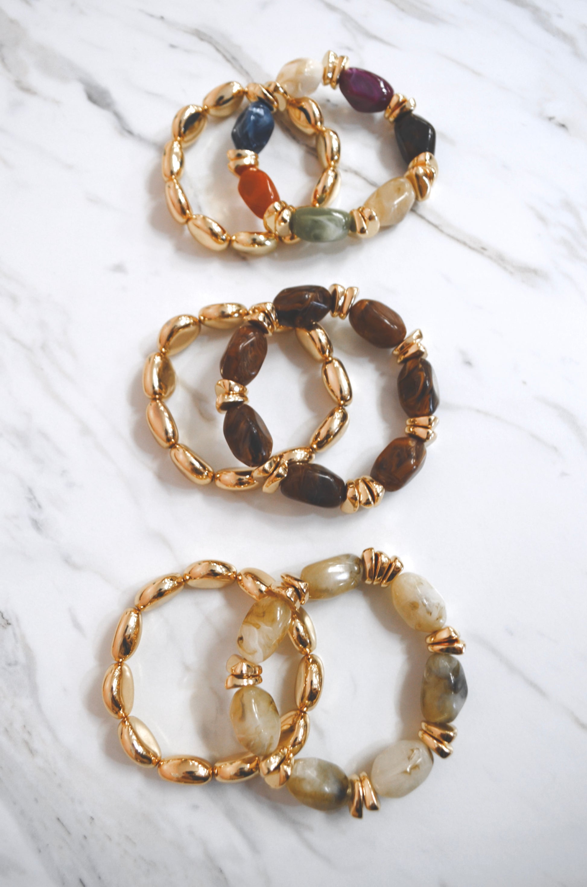 2-piece, chunky beaded, bracelet set. This weighted accessory has a gaudy and chic appearance. Featured on a stretchy elastic band that is easy to apply.