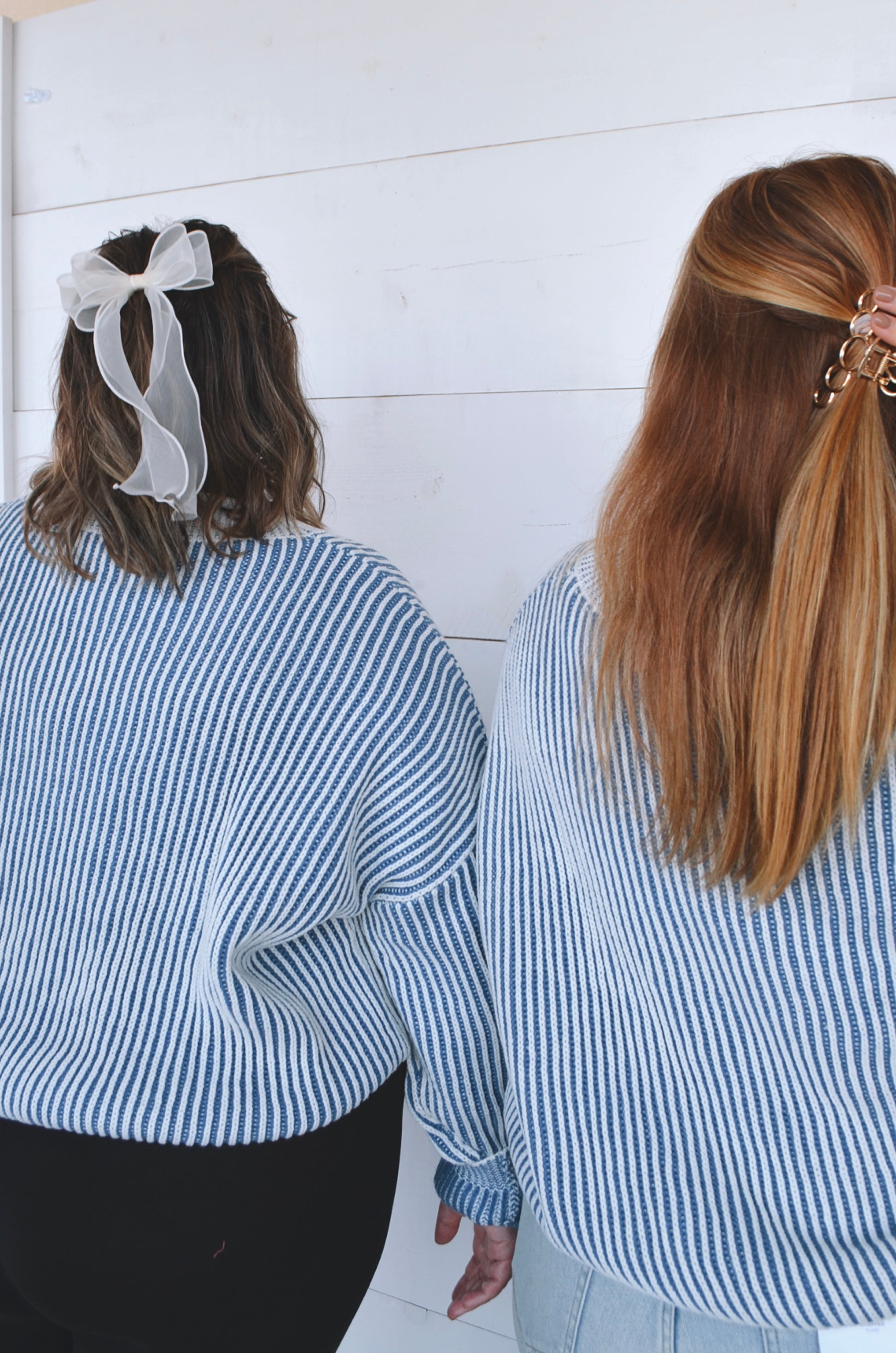 Slouchy, v-neck, sweater. This thick 'ribbed' design is lightweight and great for layering. Dropped-shoulder design has a relaxed appearance and the top itself has a boxy silhouette. Long-sleeves taper towards the wrists. Made from a soft and semi-fuzzy knit fabric.