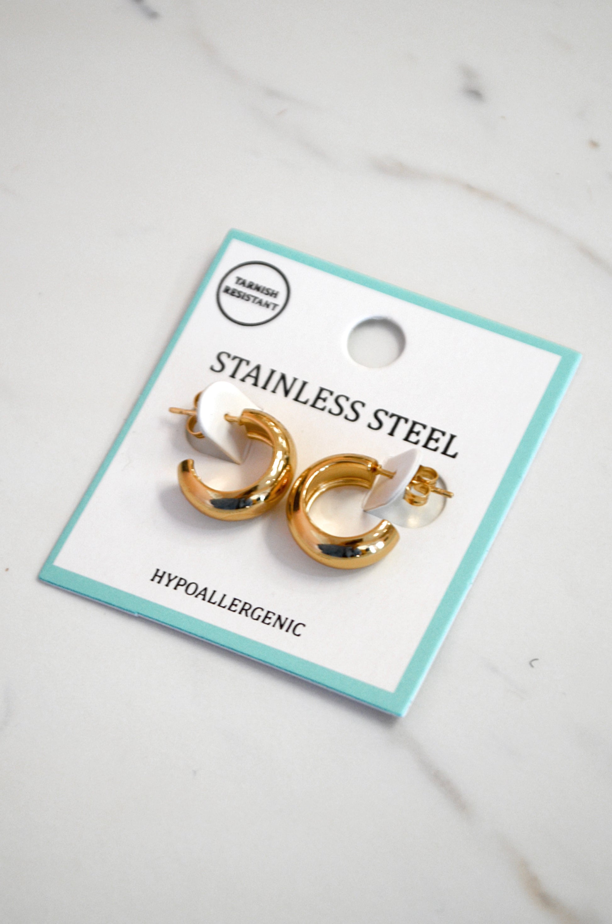 Yellow gold, dainty hoop, earrings. This half-hoop accessory is small and size and perfect for everyday wear. Made from a durable, hypoallergenic, stainless steel material. The metal is water resistant and non-tarnishing.