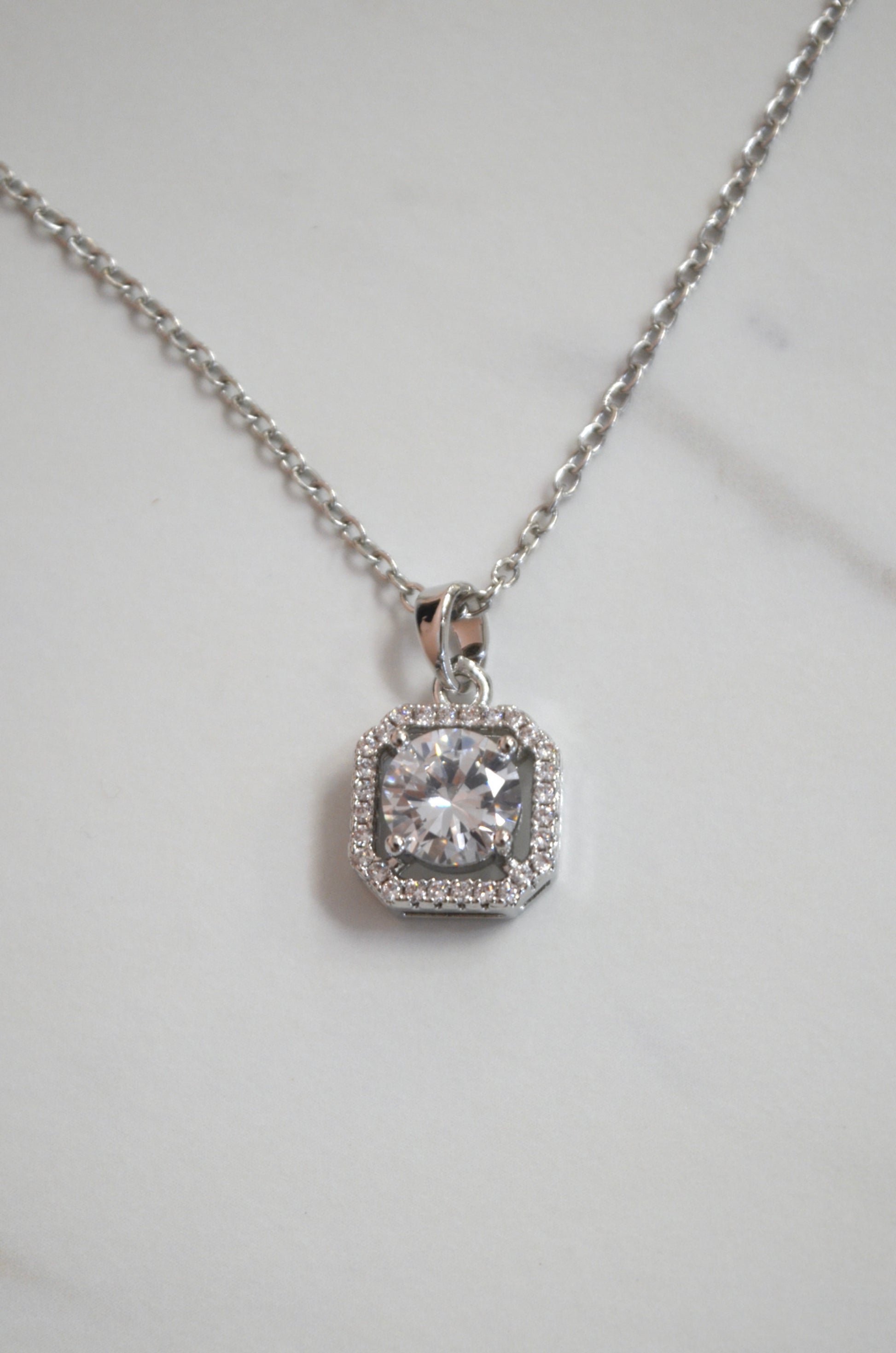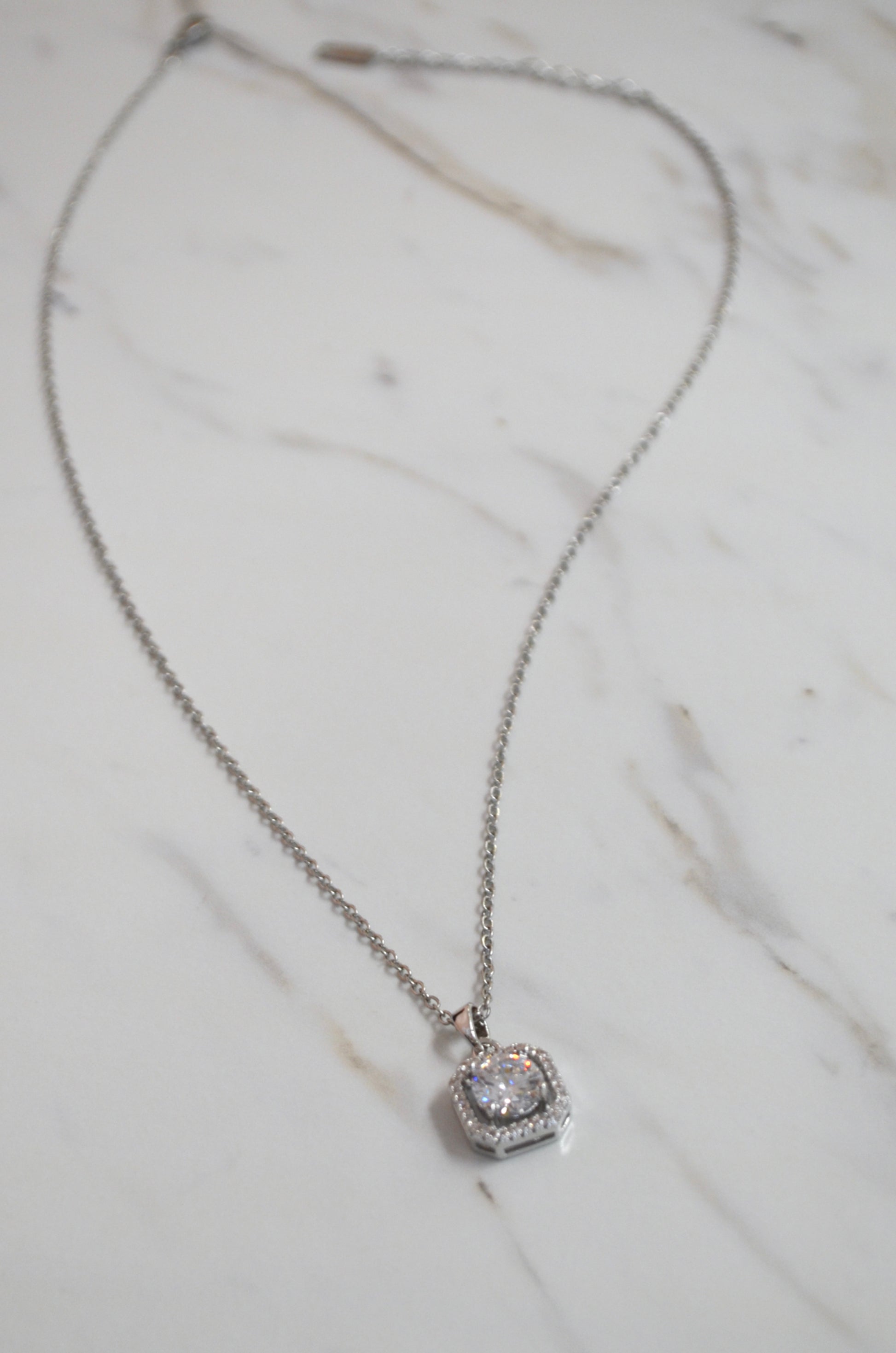 Fancy and chic, stone, necklace. Shiny clear stone with a gorgeous cut that refracts light. Surrounded by a pave setting, this dainty and delicate necklace is perfect for every day wear. Featured on a stainless steel chain that has 3" of adjustable space. Traditional lobster clasp closure.