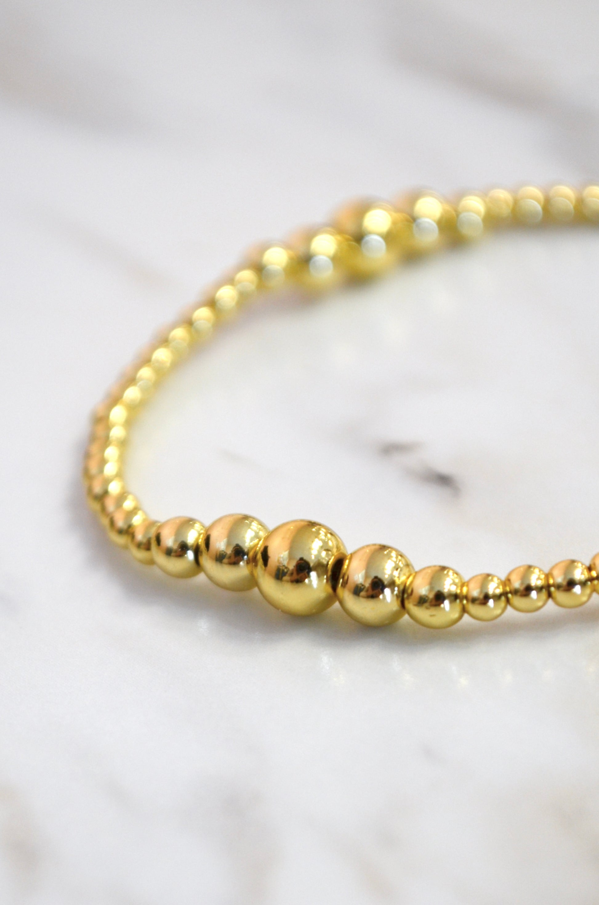 Vibrant, yellow-gold, 2-piece, bracelet set. Trendy, beaded, design on a stretchy band. Made from stainless steel, this set is water-resistant and has an anti-tarnish design.