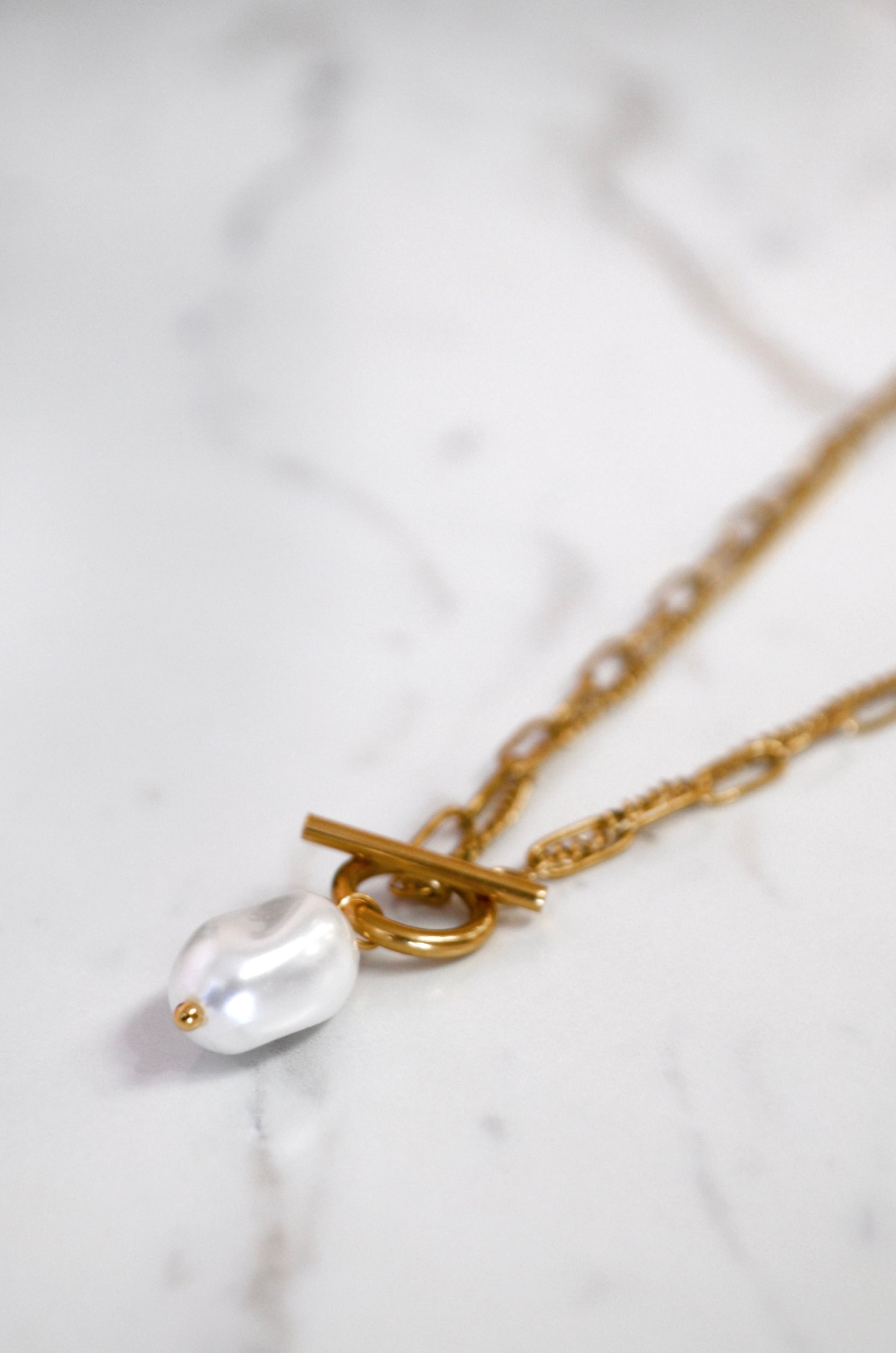 2-chain, pearl pendant, toggle necklace. This unique design has a paperclip chain and a skinny simplistic one. It secures in front with a toggle closure that leads to an irregular shaped faux pearl detail. Made from a stainless steel metal.