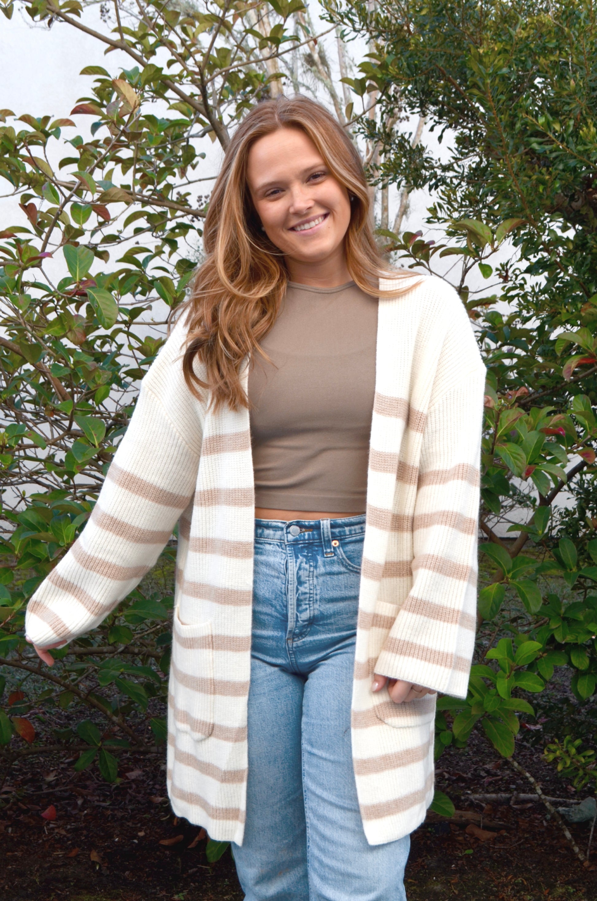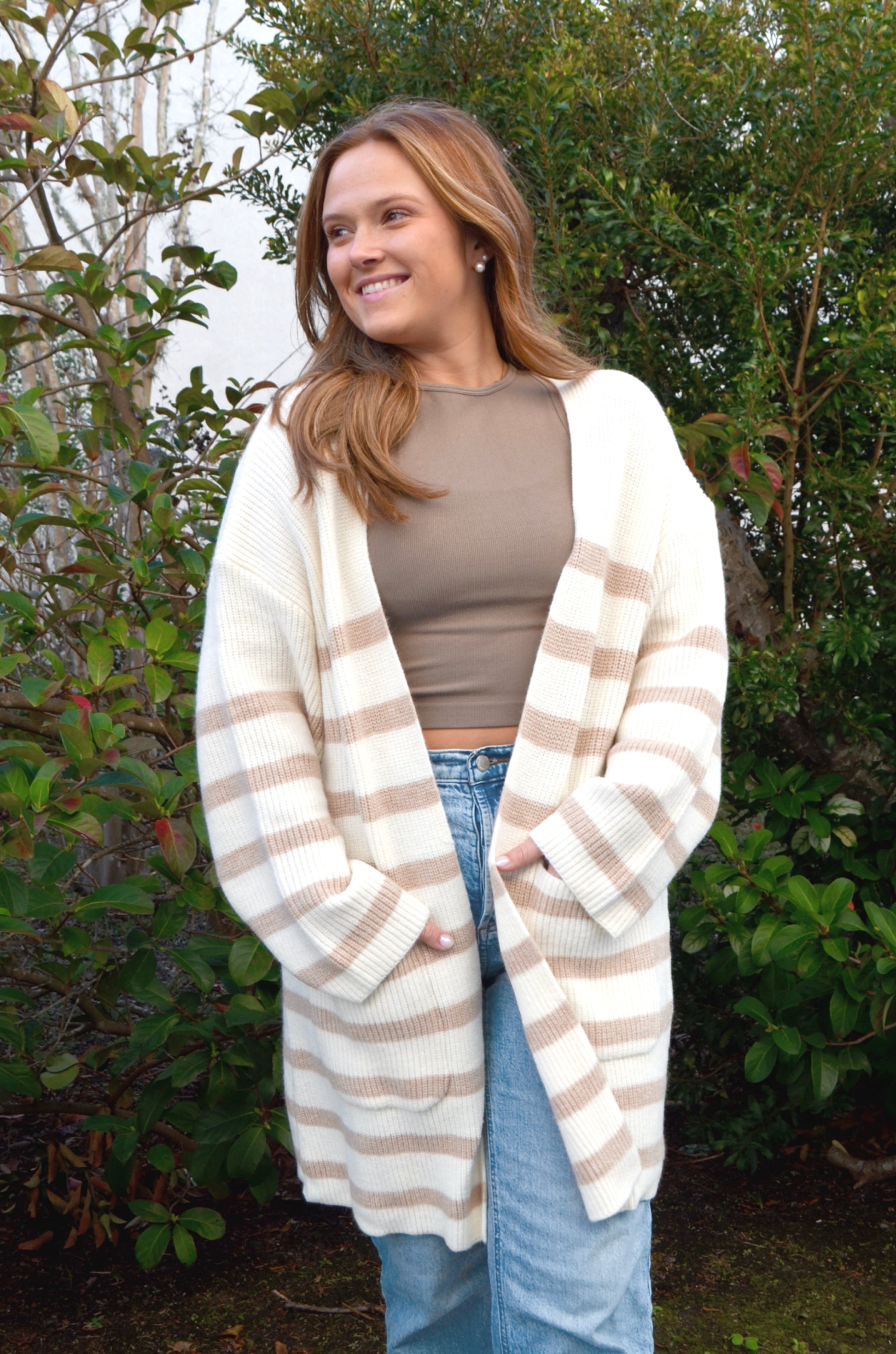 Oversized, longline, cardigan. This weighted knit material is soft to the touch, warm, and stretchy. It has a relaxed fit with a drop-shoulder sleeve that is non-fitted. Functional pockets are woven into the front of this throwover and provide convenience. An ivory base with cool taupe stripes create the perfect neutral layering piece for all seasons of the year.