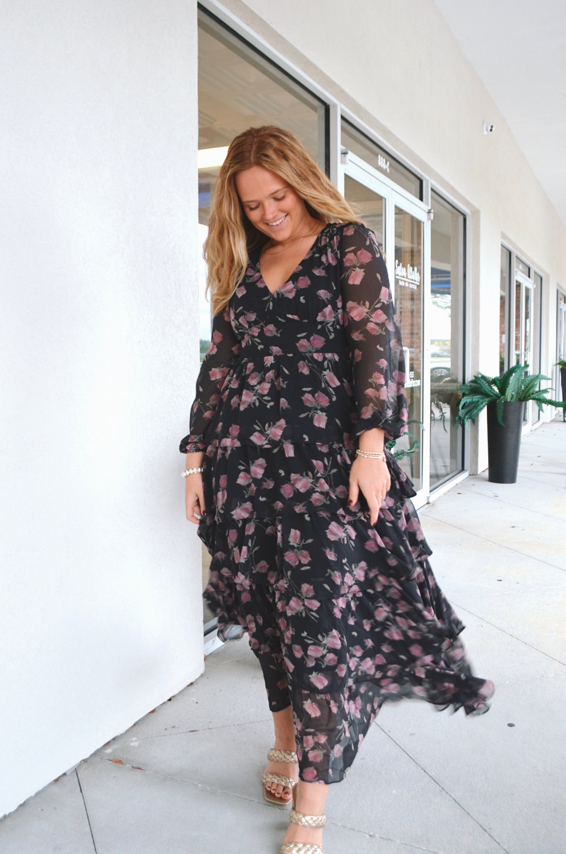 Romantic and feminine, fit and flare, maxi dress. This multi-tiered dress has a ruffled skirt and sleek bodice. Fitted v-neckline and structured bust create an expensive and luxurious appearance. The sleeves are made from a sheer and flowy material that is breathable. Features a side zipper under the arm for ease as well as an elastic waistband in the back.