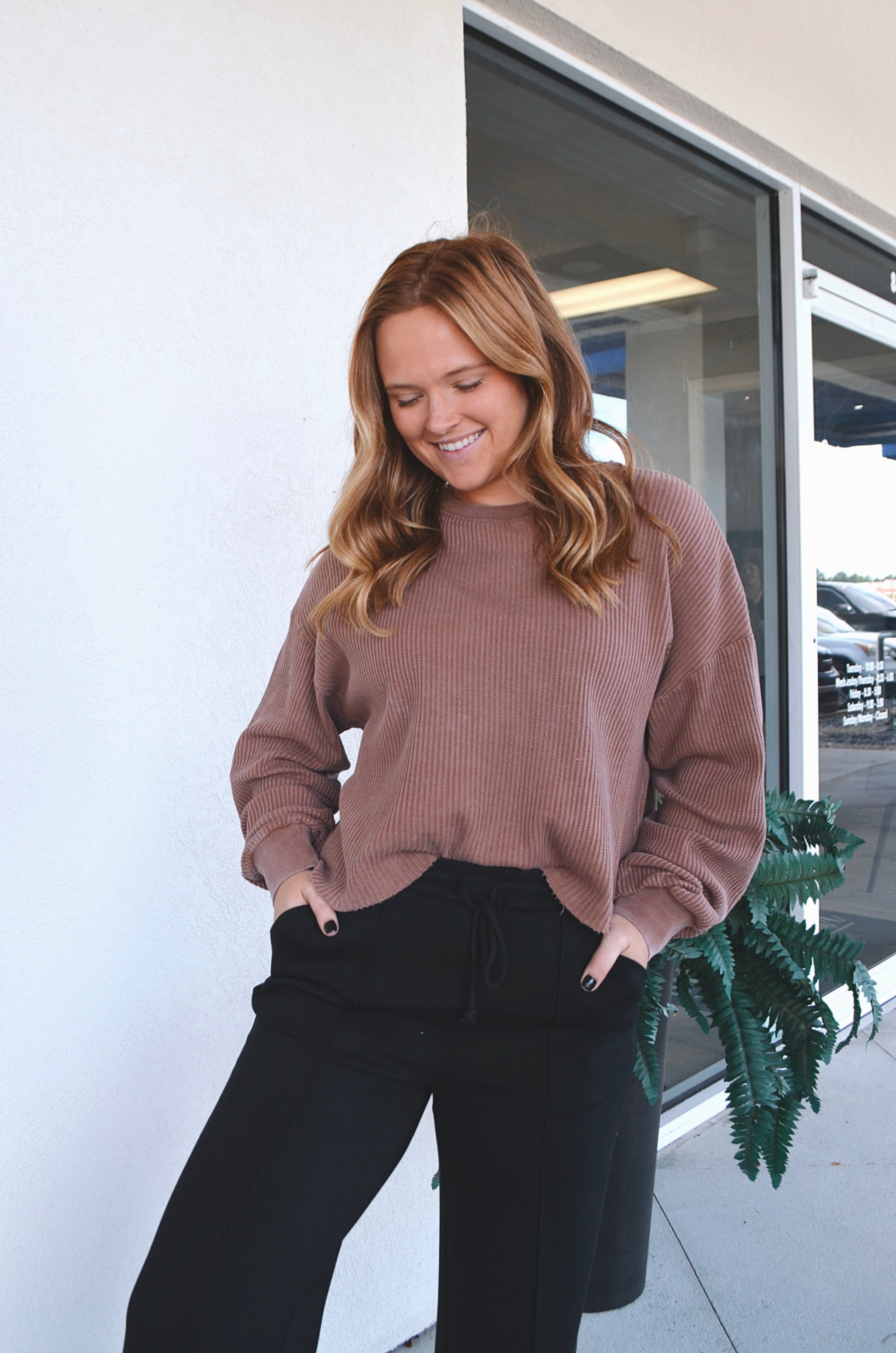 Cafe brown, cropped, waffle top. This lightweight and breathable shirt has a slouchy, long-sleeved, design and a boxy silhouette. Made from a soft and stretchy material. Timeless rounded neckline and a dropped shoulder create a relaxed appearance. Features a raw hemline and wide-banded cuffs at the wrist.